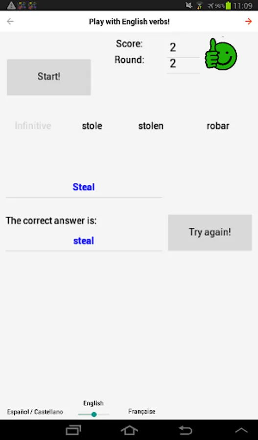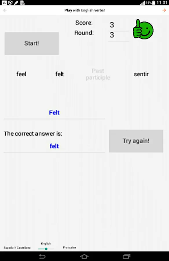 • This app is simply a game that replaces the typical "pass the lesson" with Q&A (questions and answers): The app sometimes asks the infinitive, others the past, and others the participle; and if you want, the app can also ask the meaning in Spanish or French. Based on play and practice, you will learn the irregular English verbs in the three tenses (v1 v2 v3), as you learn at school / college (primary / ESO).