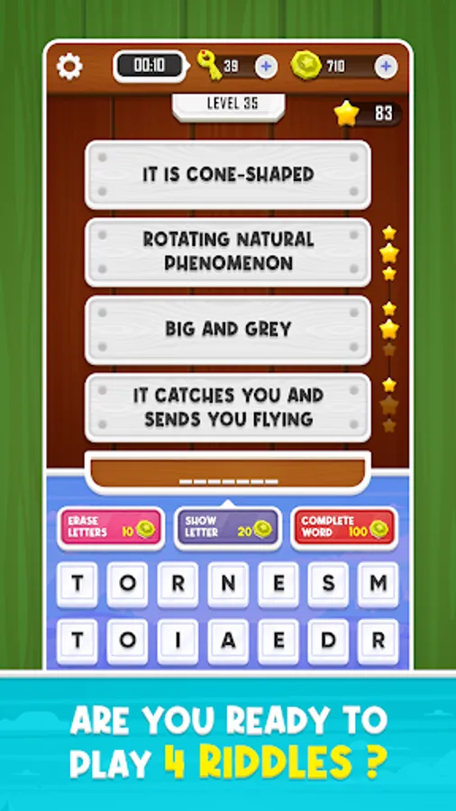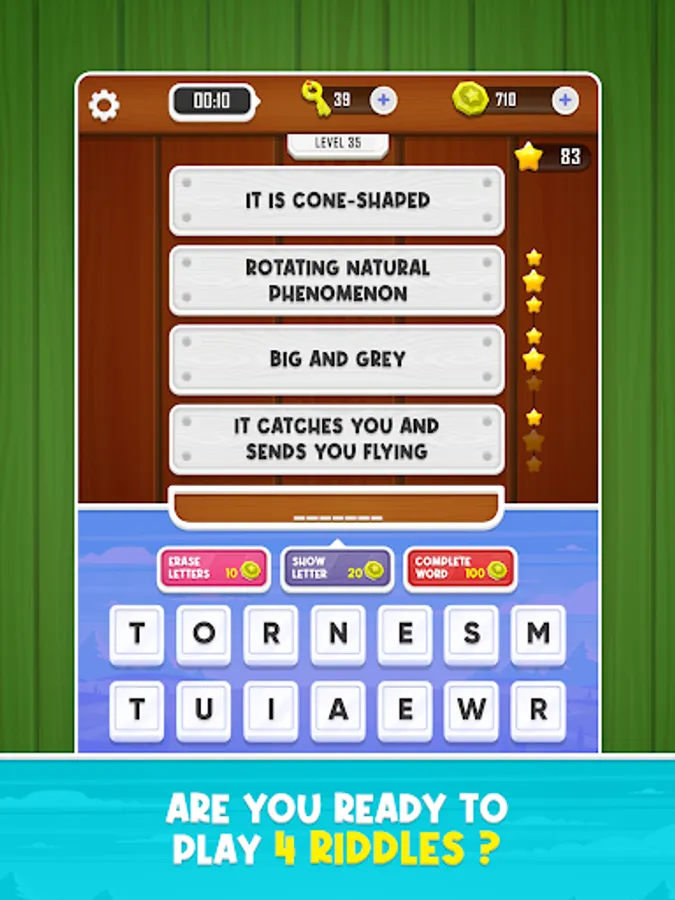 Do you want to relax with easy riddles with answers? Or maybe you are the riddle guru and want hard and tricky riddles? Well, you get all that with 4 Riddles. We added 4 difficulty modes that you can choose before you start the word riddle quiz. This also means that this brain riddle game can be played by kids, teens, adults, seniors.. anyone who is up for solving riddles with answers.