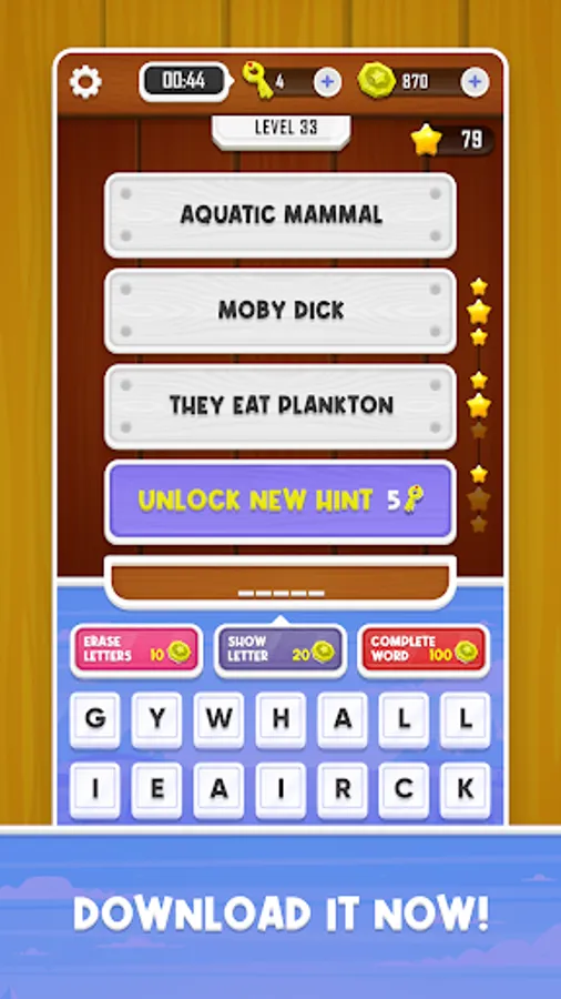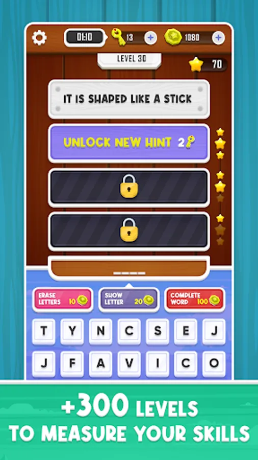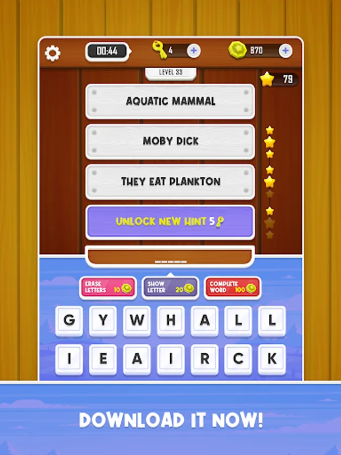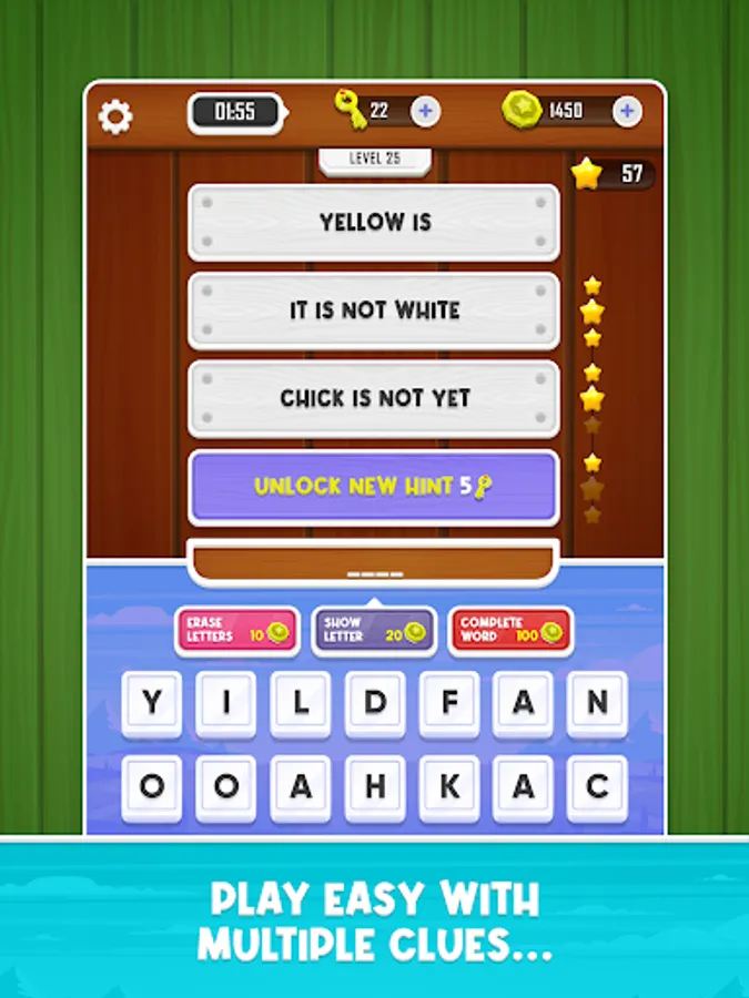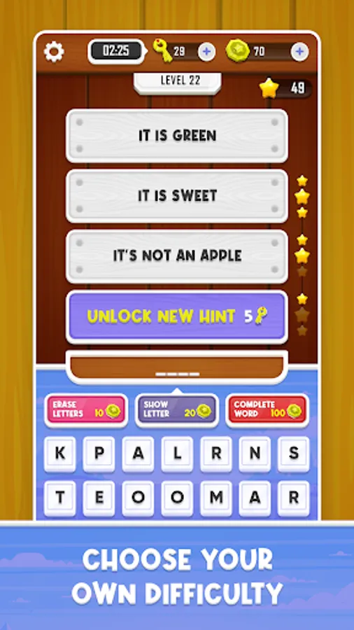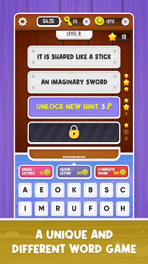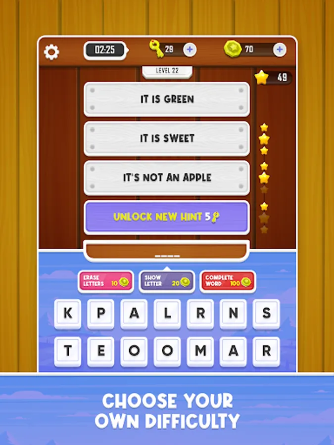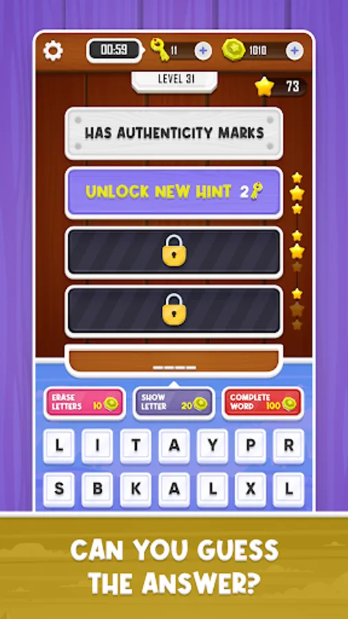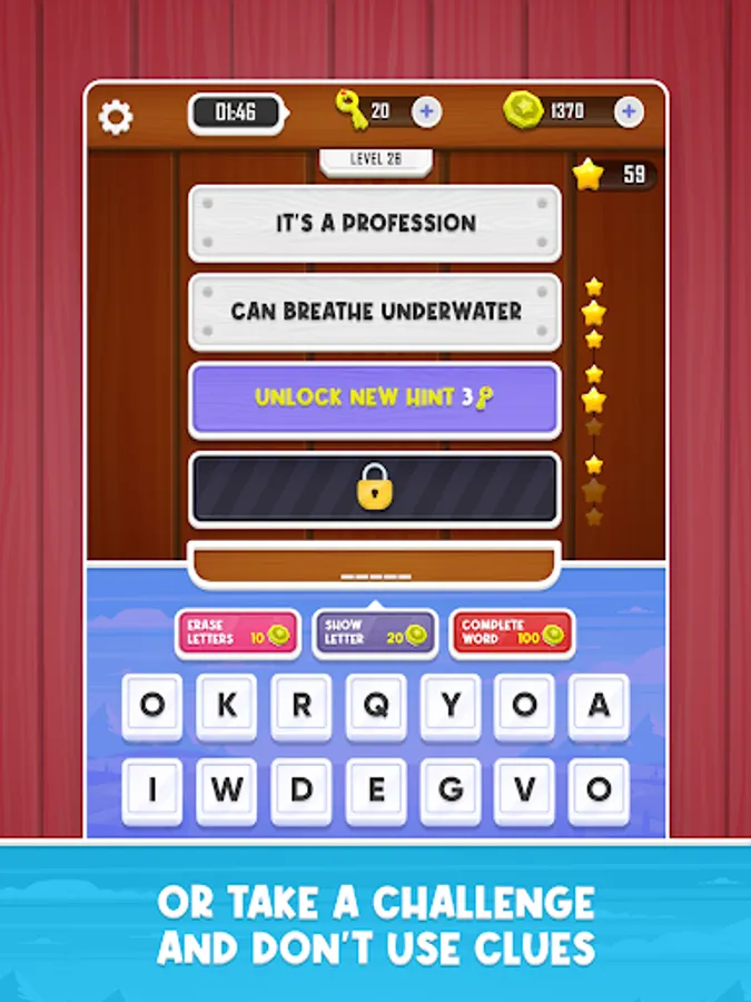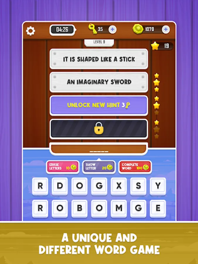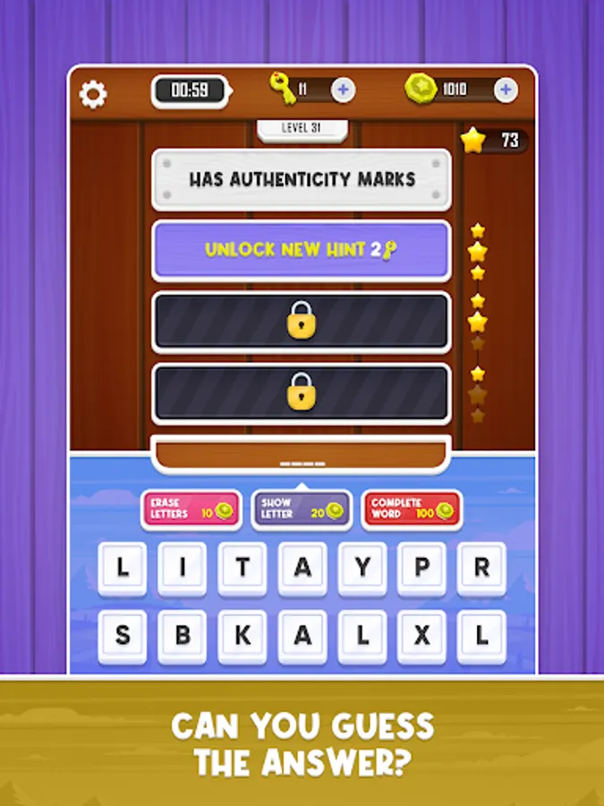 Currently, there are 360+ levels (with more to be added), and each comes with a different brain challenge. You need to guess the word riddle by using the available letters at the bottom. For an extra challenge, there is a time limit. Do you think you can solve them all? Start your trivia word puzzle quest now!