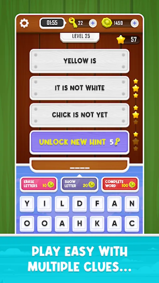 Our solve riddle game comes with different hints that can be used when the going gets tough in the harder levels. The riddle hints give a more detailed description of the word. There are also boosters such as the help where you get a correct letter, or when a wrong letter gets removed.