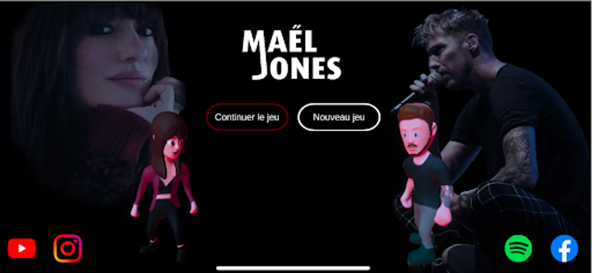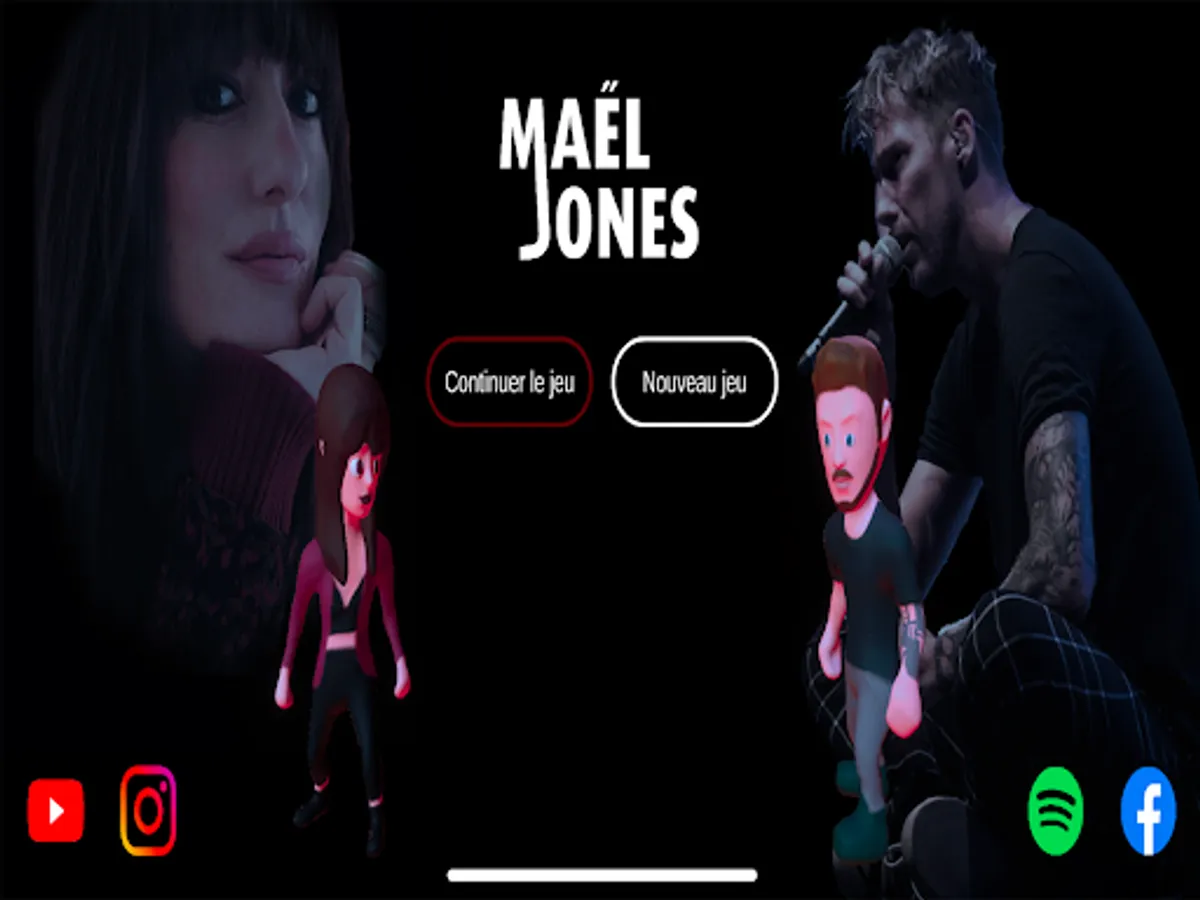 A game of 11 levels which includes the 11 tracks from the album of the electro-pop duo Maël Jones. Choose your character and earn as many points as possible by finding the hidden music notes and albums. Look for microphones to earn life, fight monsters with melodies to earn more points, sing to protect yourself from attacks. Welcome to the world of Maël Jones.