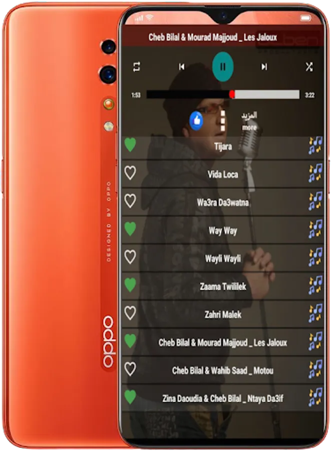 The Cheb Bilal application without Net 2023 contains many features, including: adding new exclusive Cheb Bilal songs directly as soon as they are released, the feature of adding songs to the favorites list, the feature of random transition and repetition between songs, shooting a video and listening to songs, small in size and does not take up space on the phone , and many new and exclusive features only in the application of Cheb Bilal 2023 without the net