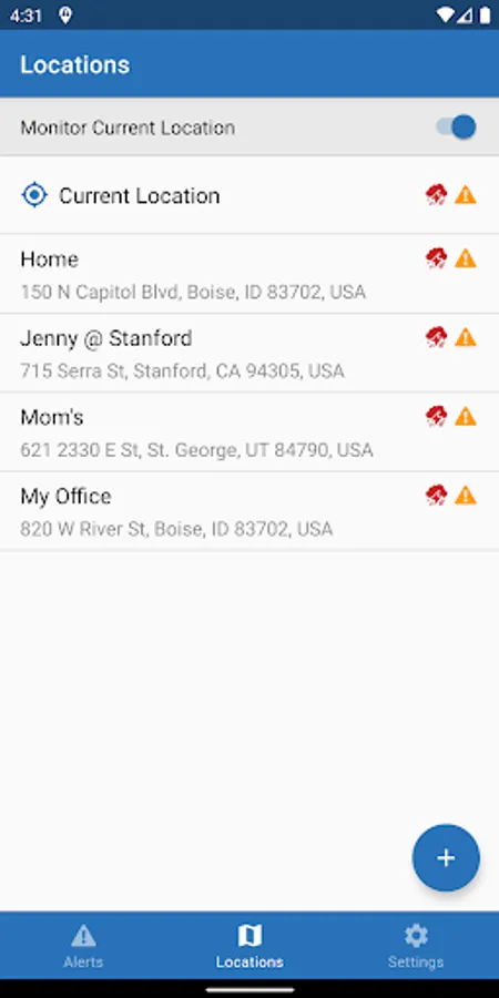 Simply add the locations that matter to you. For example, you could identify your home, your child’s school, where your aging parent resides, the university where your older child attends, and your office. When you travel, you can enable the app to monitor your current location in order to receive any emergency alerts issued for the city or area you are visiting.