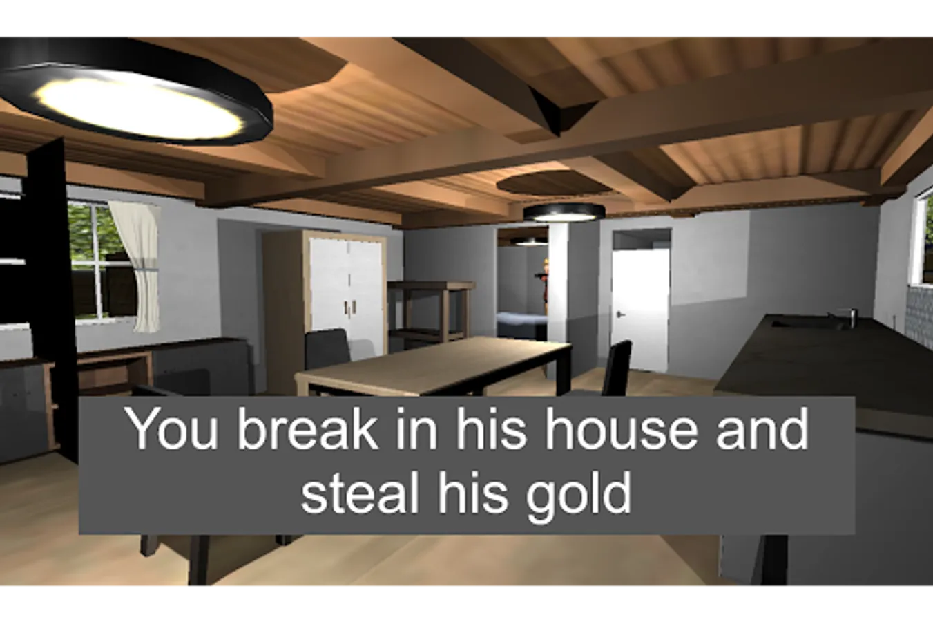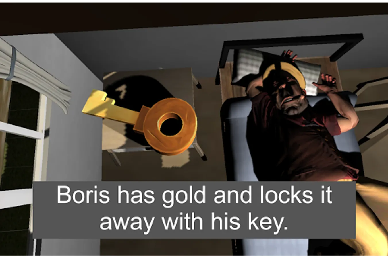You are going break into someone's house and steal the gold that is stashed in there somewhere. The owner of the house is Boris and he is no man to cross. If he sees you, he will kill you and that is not good. That is why you rob him at night, when he sleeps, and find the key that leads to the stash of gold.