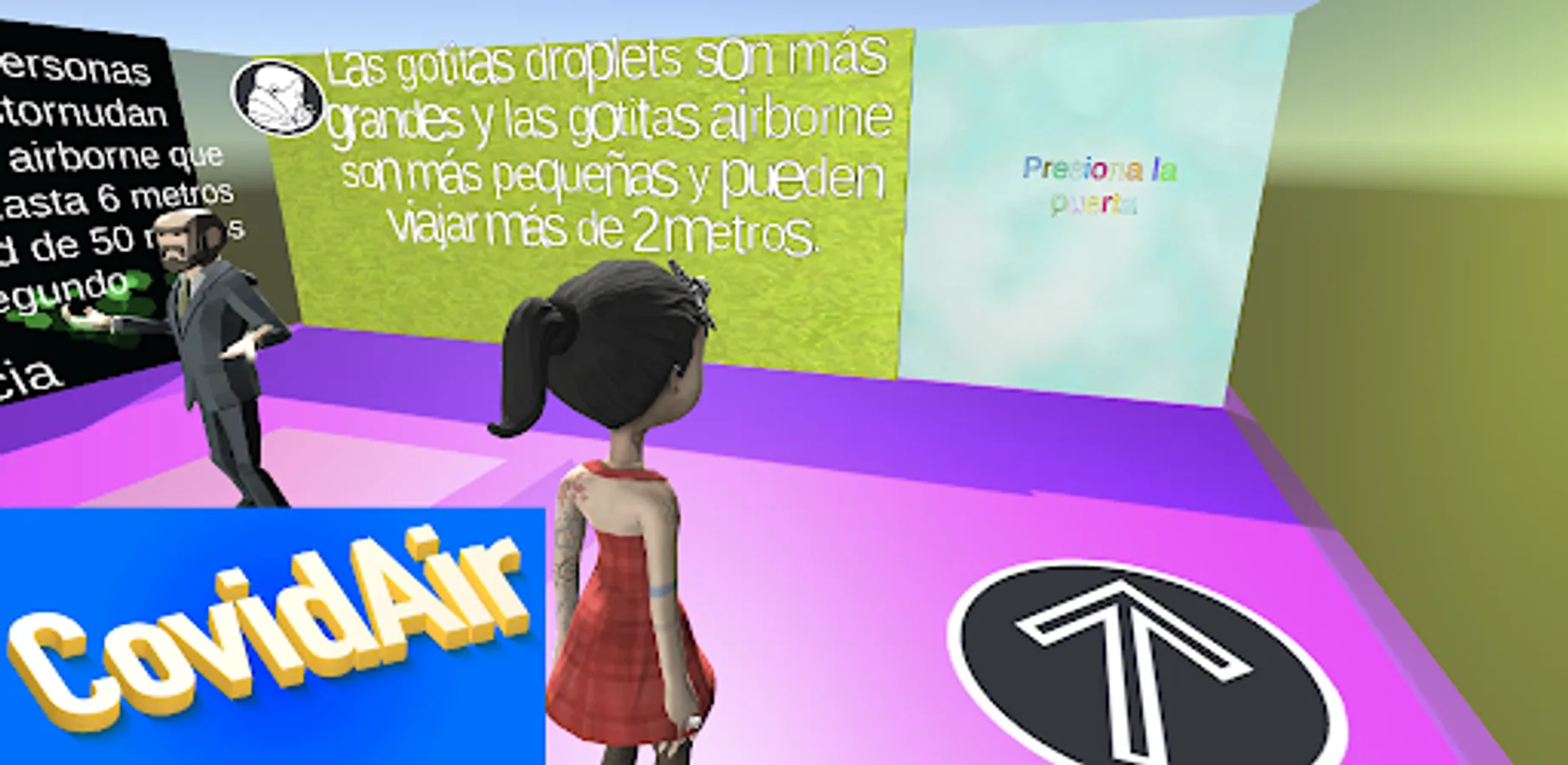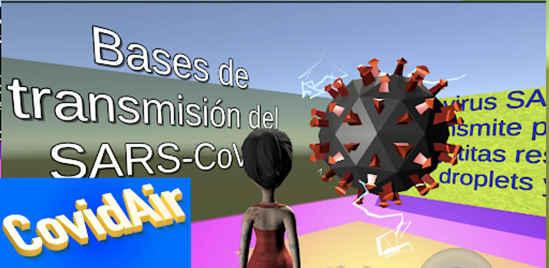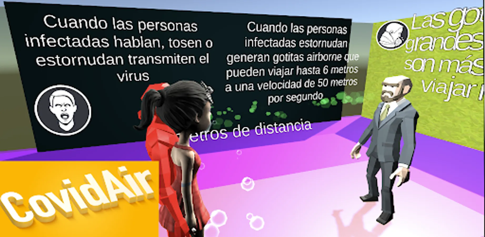 CovidAir is a simulation of the airborne transmission of the SARS-Cov-2 virus (which causes Covid-19). As you play you learn that the virus is transmitted by respiratory droplets that when a person sneezes the droplets (airborne) can reach up to 6 meters. This simulation is educational and is based entirely on scientific evidence present at the end of this simulation micro-game.