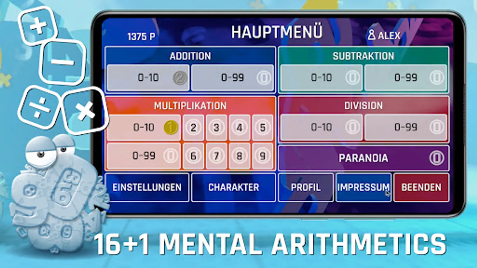 This math game helps training your mental math skills. Fight against time, gain speed and get better and better with every round. Win medals, unlock new characters and start your tiny mental math career.