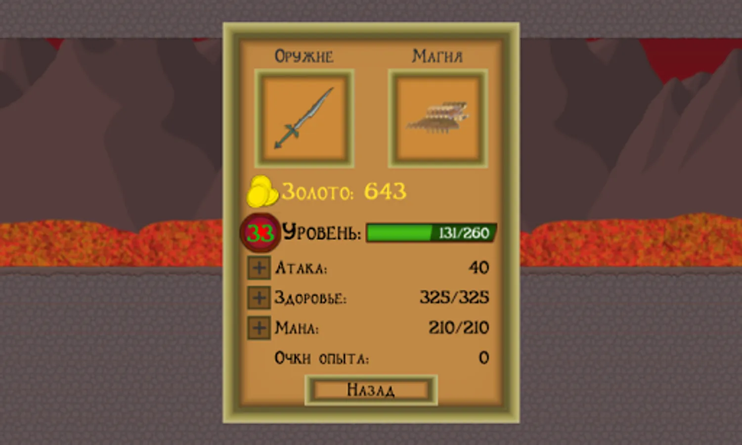 - RPG elements (levels, pumping characteristics, buying weapons and magic)