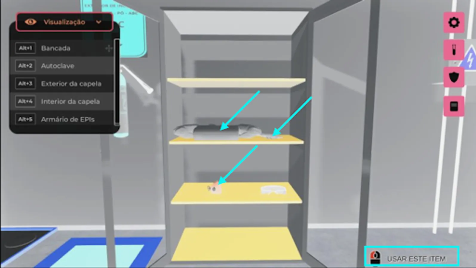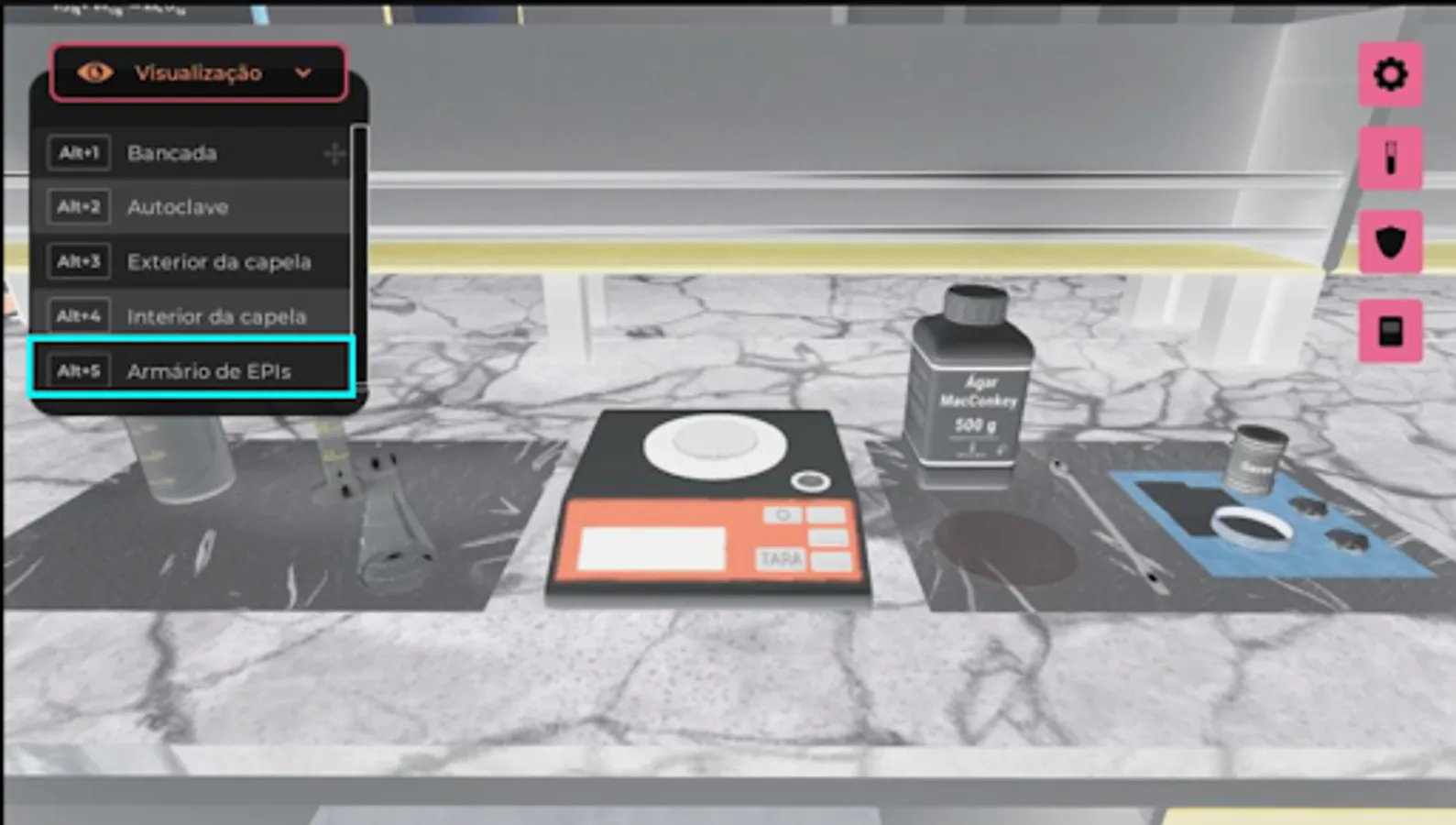 The experiment environment features a Bunsen burner on top of the workbench, as well as inputs and instruments. You must select and use them in order to guarantee the correct execution of the experiments. In addition, after making the medium, it must be autoclaved and taken to the laminar flow hood.