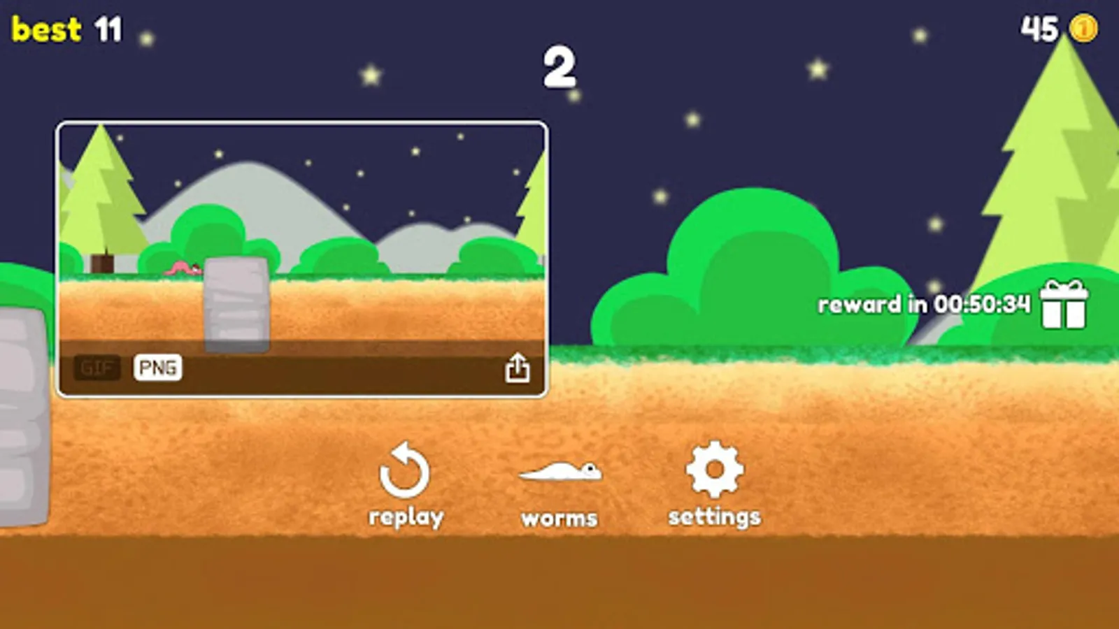 Create a GIF or take the picture of your worm as you replay your game. You can check your mistakes in the replay and avoid them when you play again. Just swipe up and swipe down on time to avoid all obstacles. Remember! The game will be harder as your worm moves forward.