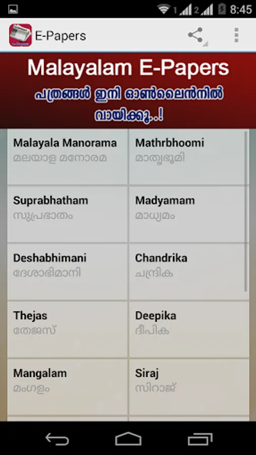 List of Malayalam ePapers in 'Malayalam E-Papers’ application: