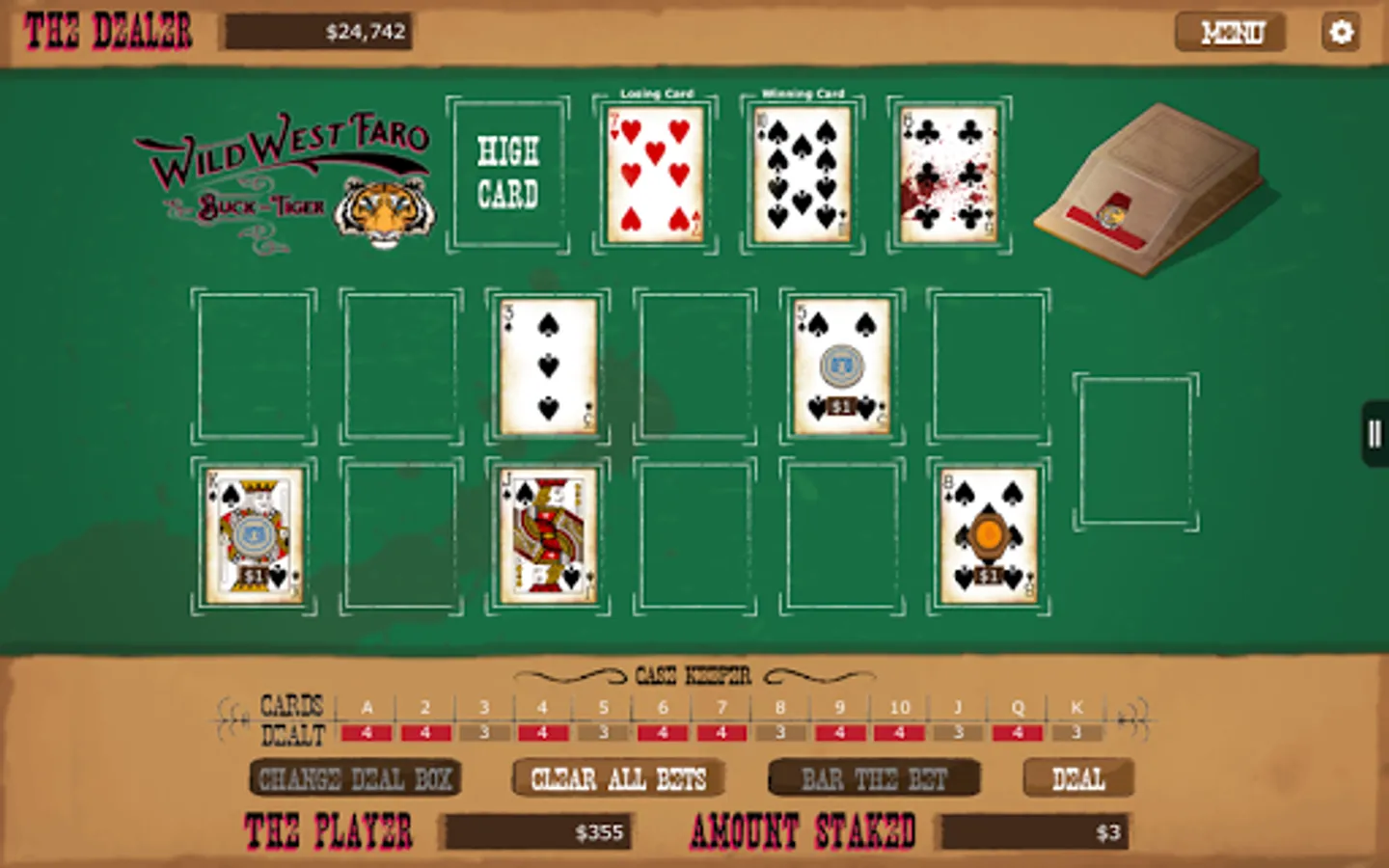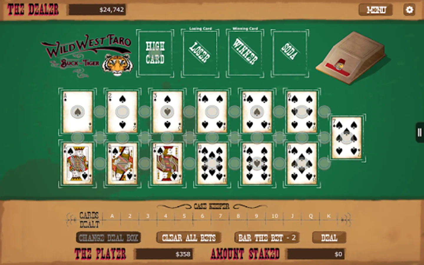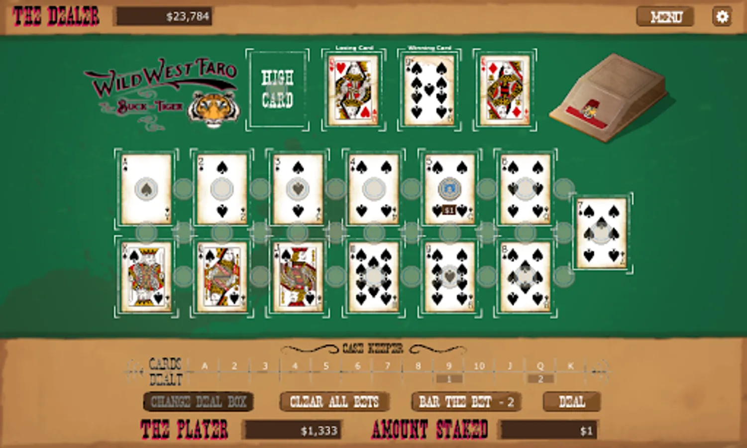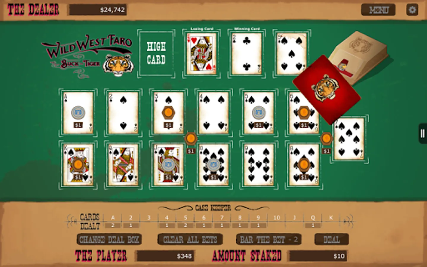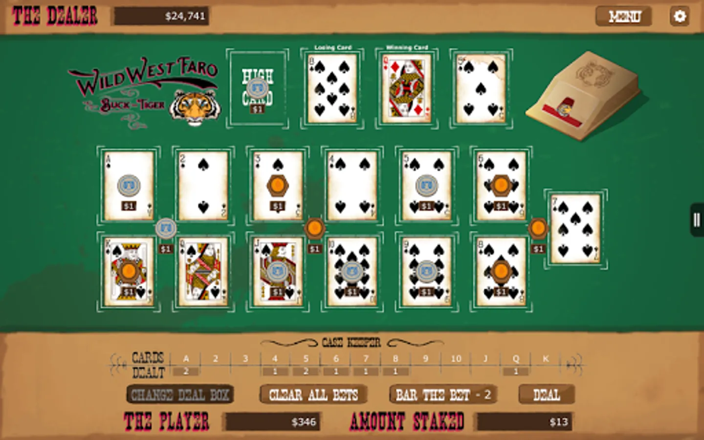 The Wild West Faro card game was the most popular card game played throughout the Old West. Known within the local Saloon as "bucking the tiger" or "twisting the tiger's tail" this name originated from the early card backs, which featured a drawing of a Bengal tiger. By the mid-19th century the tiger was commonly associated with the game. With our faro card game app you’re able to immerse yourself in a unique card playing experience and enjoy hours of fun!