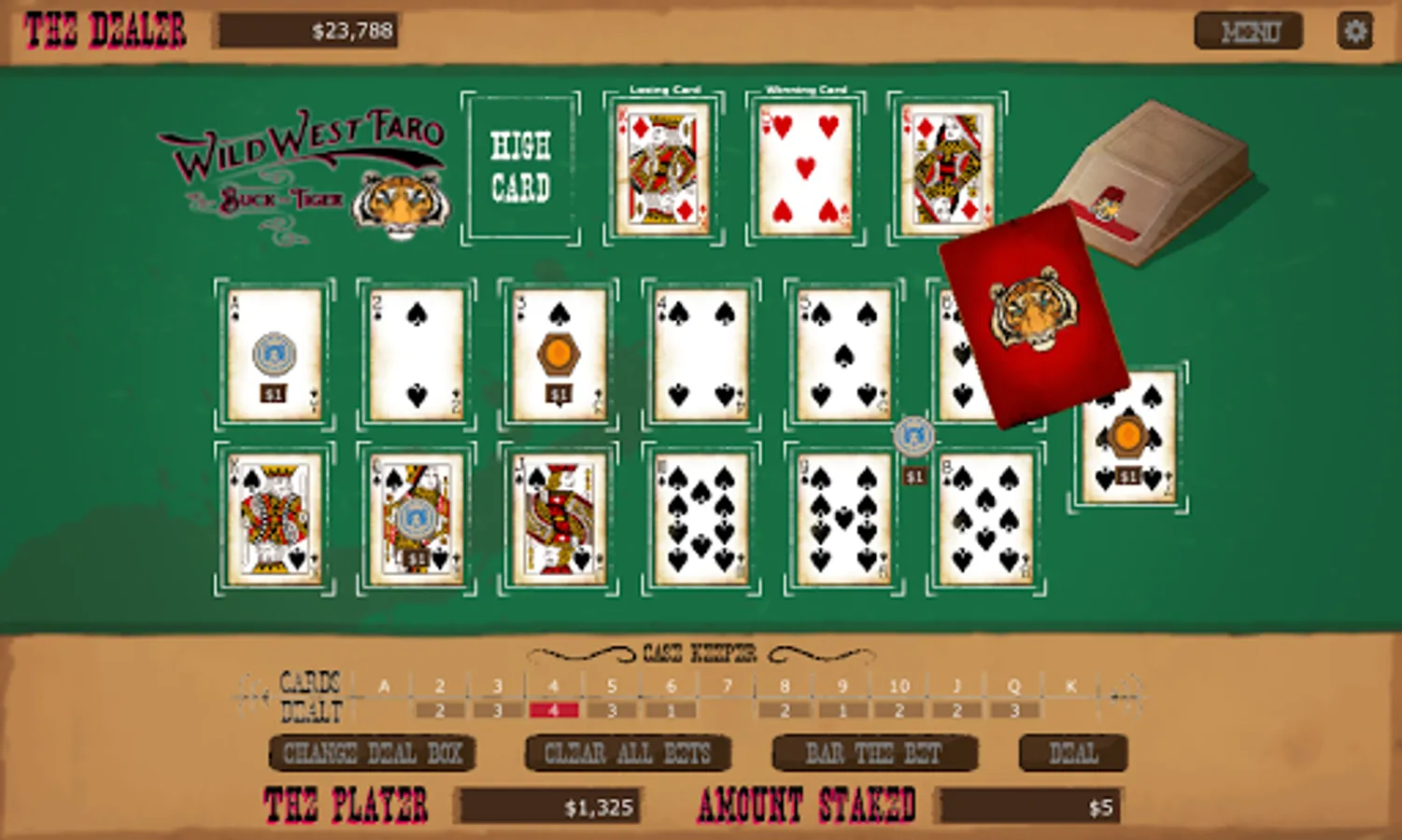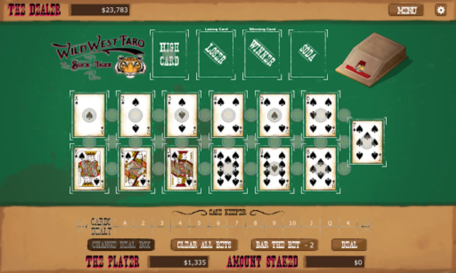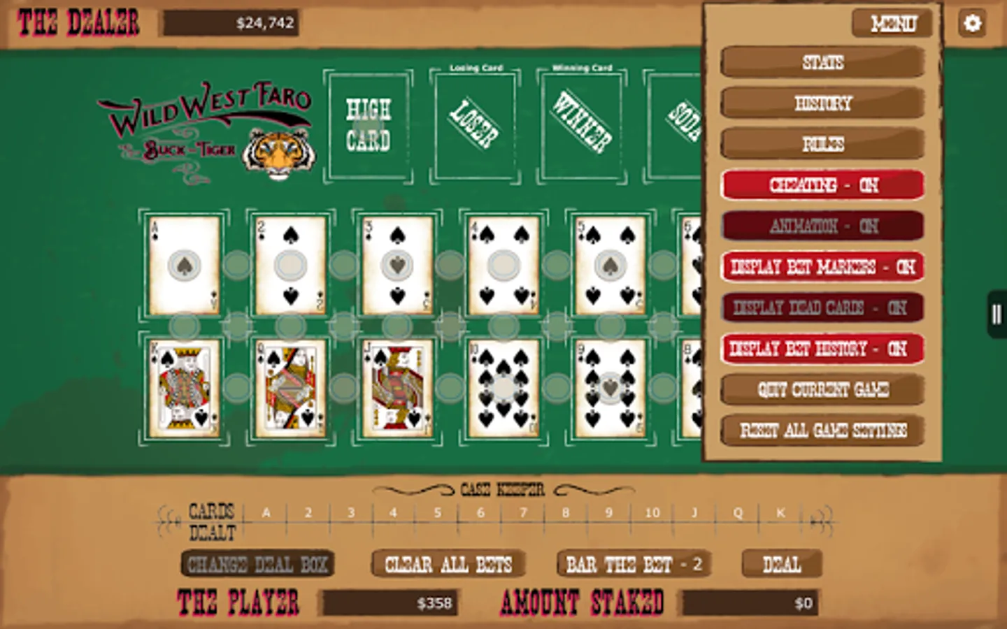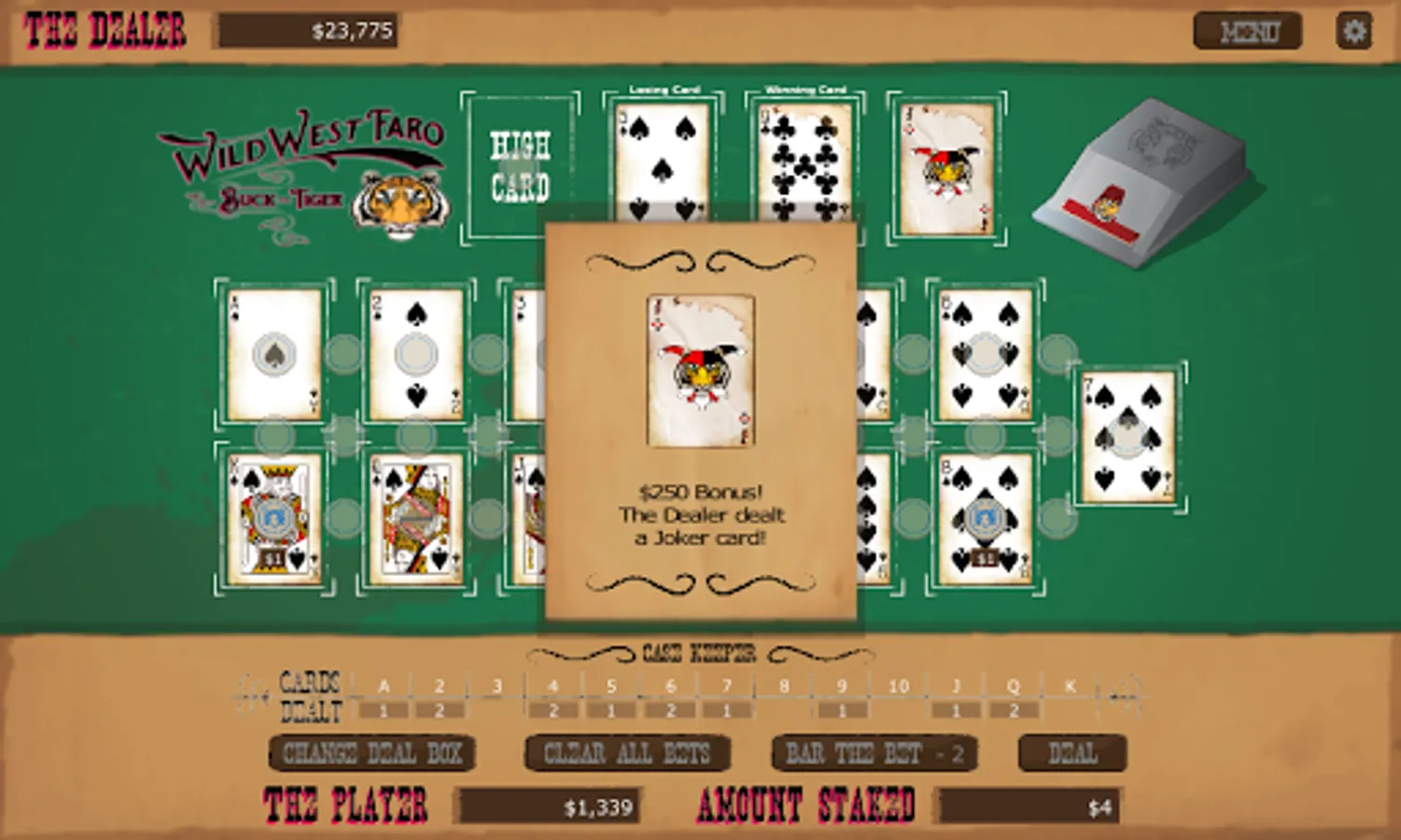 The Wild West Faro card game was the most popular card game played throughout the Old West. Known within the local Saloon as "bucking the tiger" or "twisting the tiger's tail" this name originated from the early card backs, which featured a drawing of a Bengal tiger. By the mid-19th century the tiger was commonly associated with the game. With our faro card game app you’re able to immerse yourself in a unique card playing experience and enjoy hours of fun!