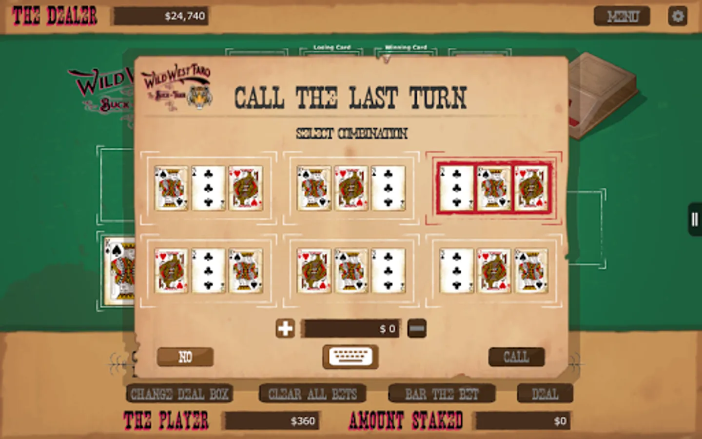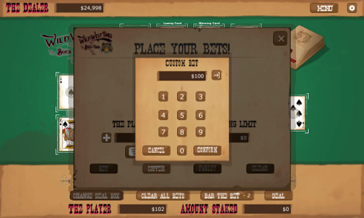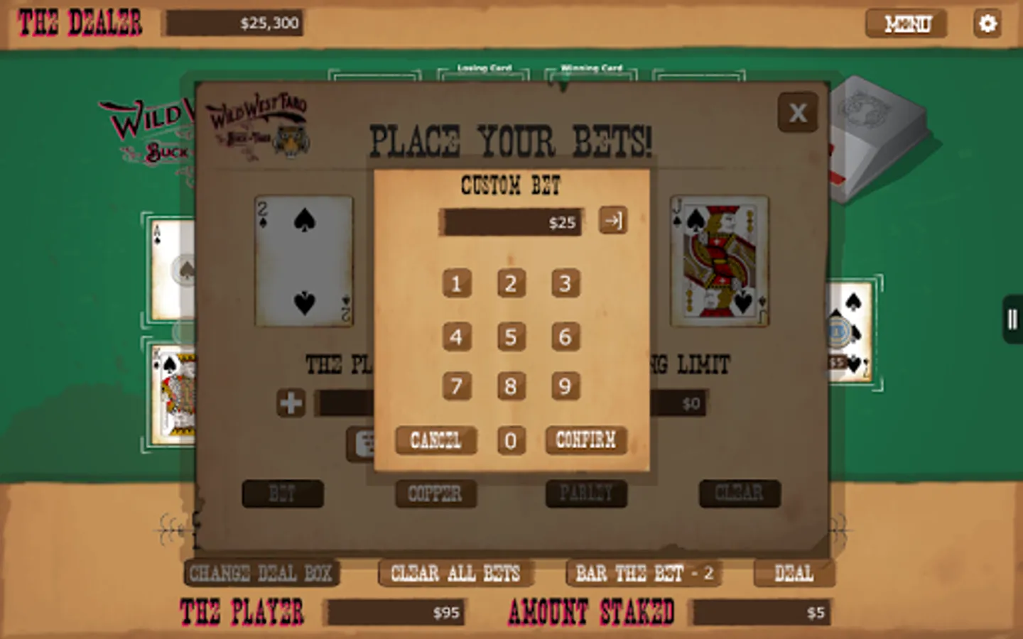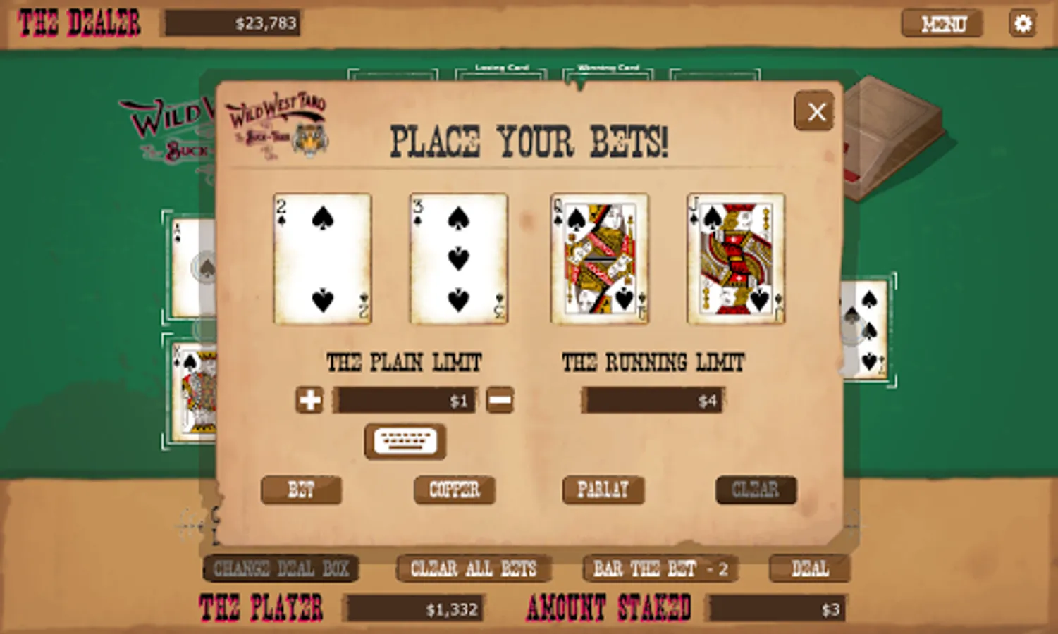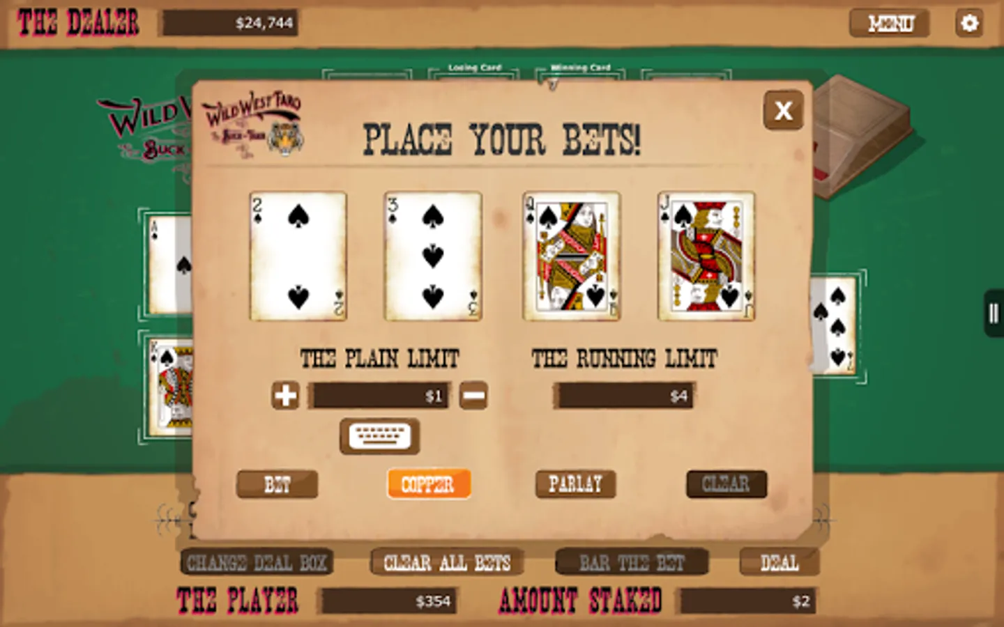 The Wild West Faro card game was the most popular card game played throughout the Old West. Known within the local Saloon as "bucking the tiger" or "twisting the tiger's tail" this name originated from the early card backs, which featured a drawing of a Bengal tiger. By the mid-19th century the tiger was commonly associated with the game. With our faro card game app you’re able to immerse yourself in a unique card playing experience and enjoy hours of fun!