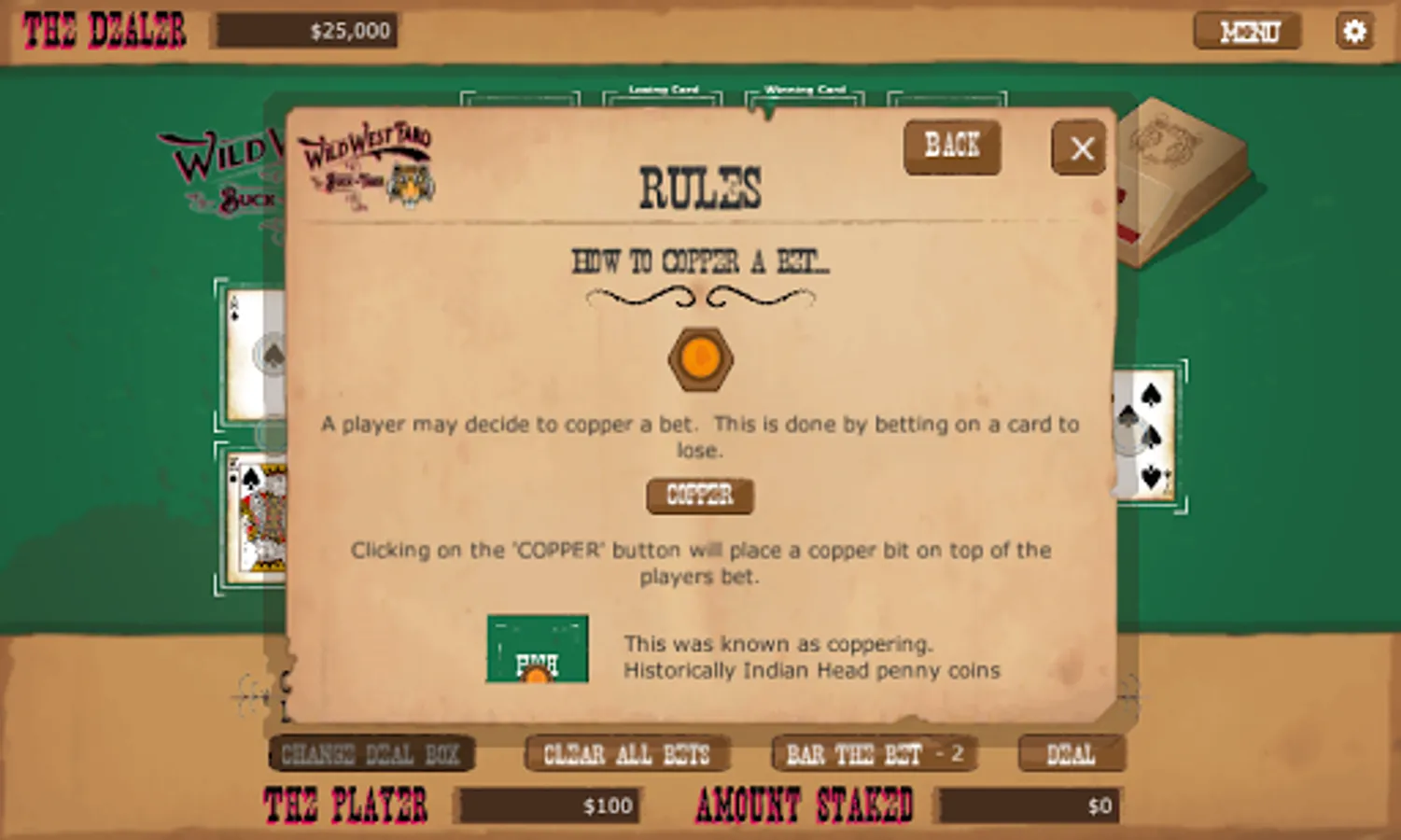 The rules of this version of the Faro card game are similar to the original. The betting layout consists of a suit of Spade cards, from Ace up to King. Players would bet on the card of their choice or multiple cards. The dealer would then exposes cards in pairs, a winner and a loser card, the dealer would then pay out or collect accordingly depending on whether you won or lost. Wild West Faro allows you to place several different types of bet, such as bet on the High Card, a parlay bet, a single bet card or multiple bets on several different cards to either win or lose, when betting on a card or cards to lose, this is known as coppering the bet. You can place as many bets as you want before dealing, betting from $1 to $1 million in an effort to break the bank by winning all of the Dealers money!
