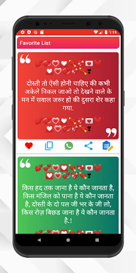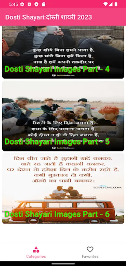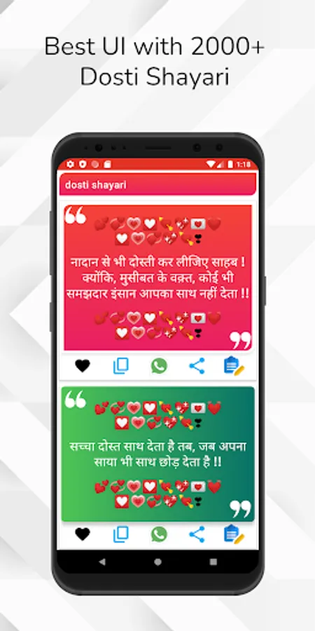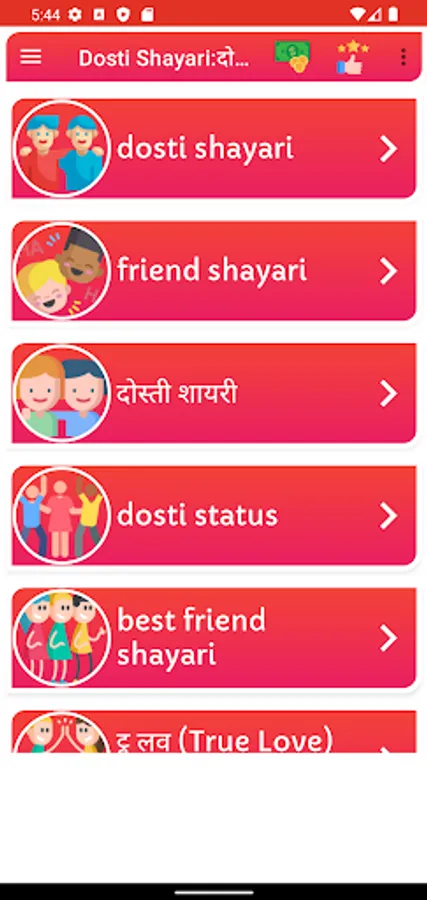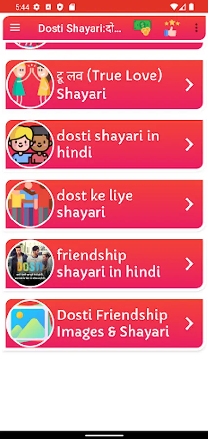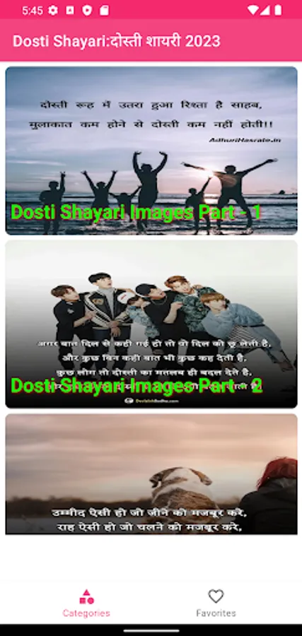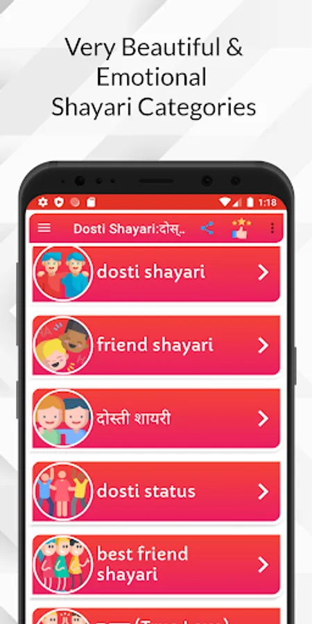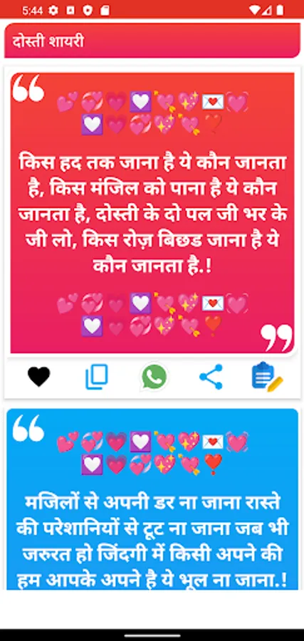 This Dosti and friendship Shayari app is an amazing and great Shayari application having a lot of Shayari messages for you offline to use. also categories as well Dosti, veer Shayari, Hindi friendship Shayari,