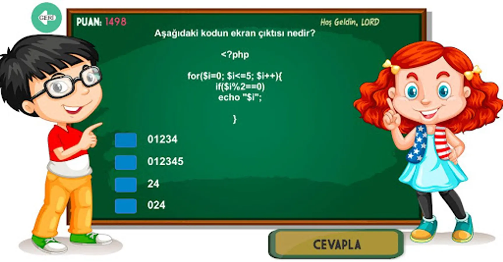 Thanks to the PHP Coding Game, you can learn the basics of PHP and test the acquired knowledge in the question and answer section. In the question and answer section, correct answers are given +1 points, while incorrect answers are given -1 points. The top 10 users with the highest score are instantly updated and published on the Top List screen.