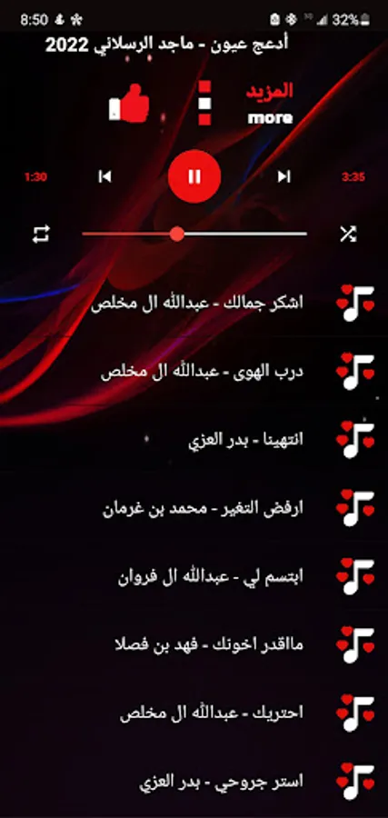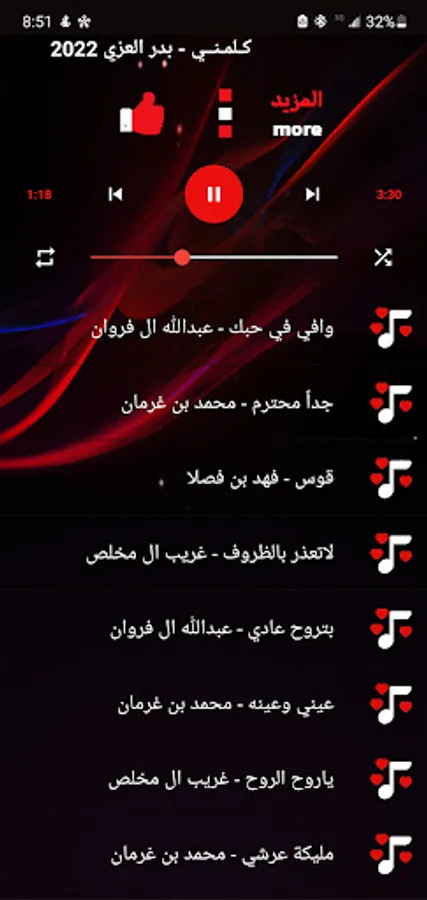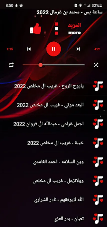 The application also includes a selection of artists: Sheilat Badr Al-Ezzi, Sheilat Gharib Al Mukhles, Sheilat Muhammad Butt Gharman, and Sheilat Abdullah Al Farwan.