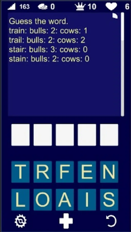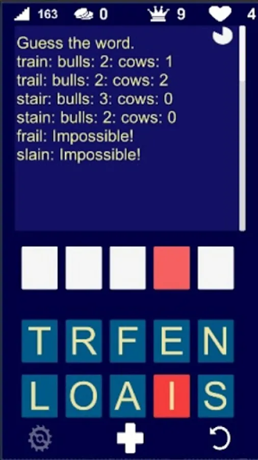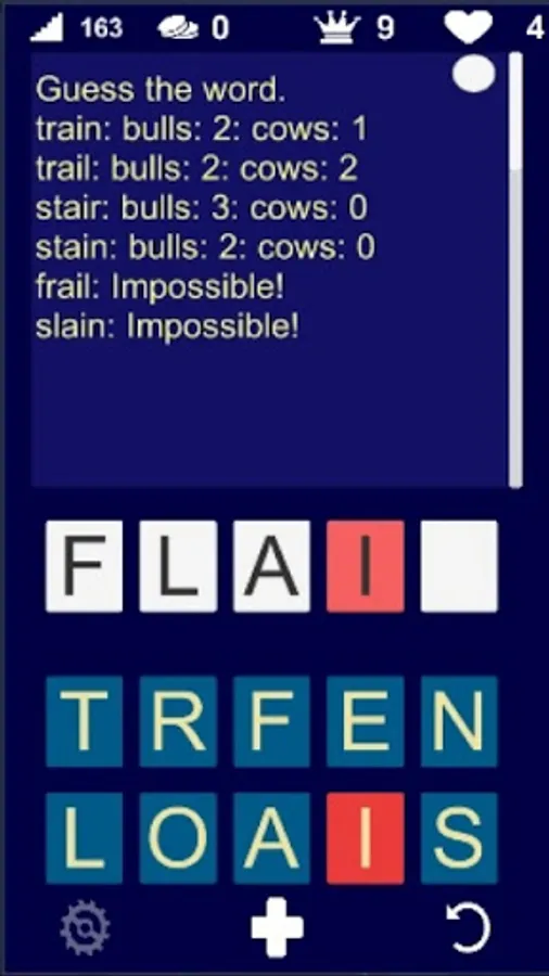 This word puzzle game offers challenge to your erudition and logic skills. It is based on the Mastermind (or Bulls and Cows) mechanics. You have to guess which word is hidden - it's a modern word version of the old code-breaking mind game. The secret word must be a real English word, a noun. It also must be an isogram: its letters must be all different. You may play with 4-letter or 5-letter words.