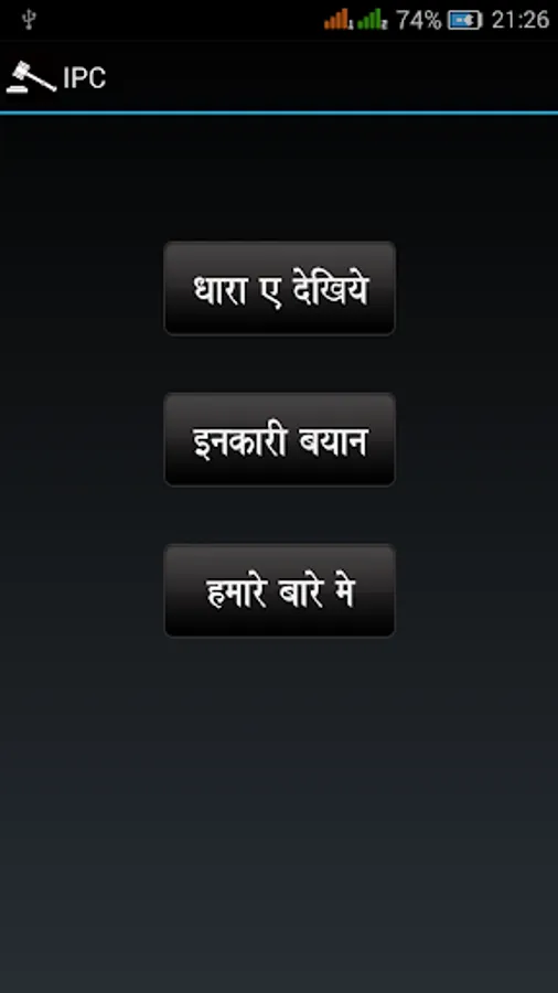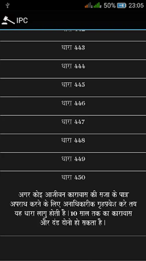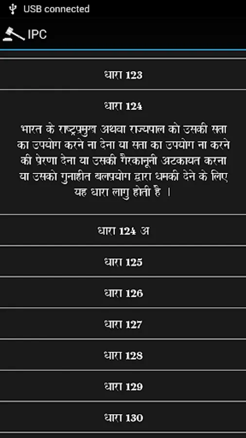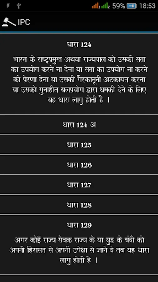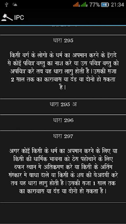 This application is developed with aim of spreading awareness for peoples who live in India by providing information about Indian penal code.This application is developed for people who have android device with Hindi support. Although this application is developed in Hindi more and more Indian people can use this application for knowledge purpose.