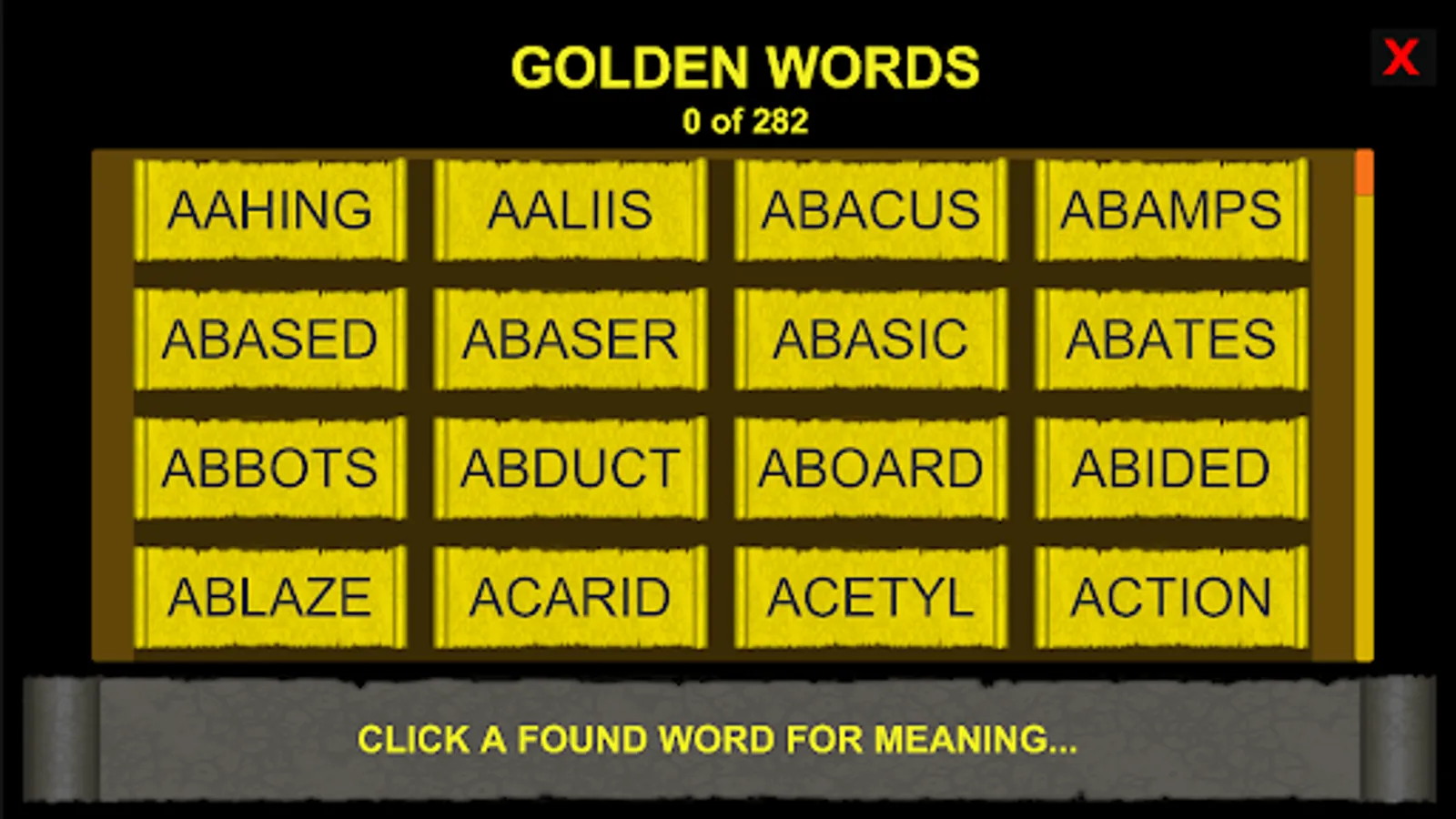 Golden Words dictionary, Collect them by completing full Anagrams.
