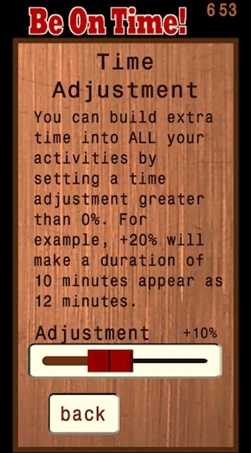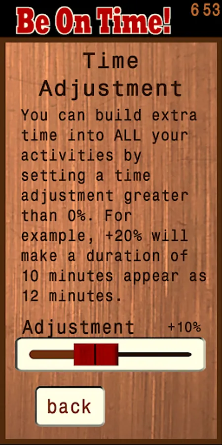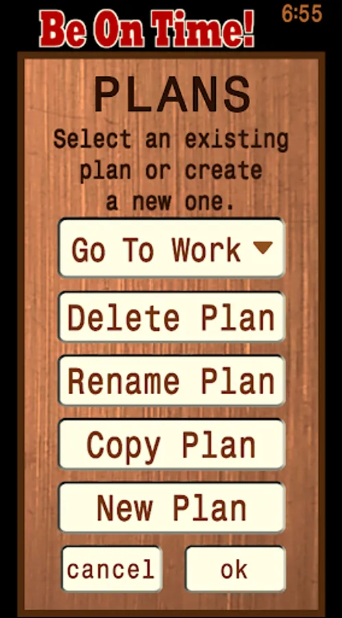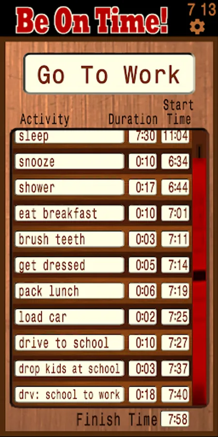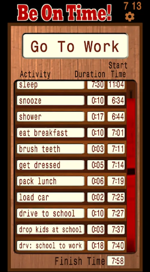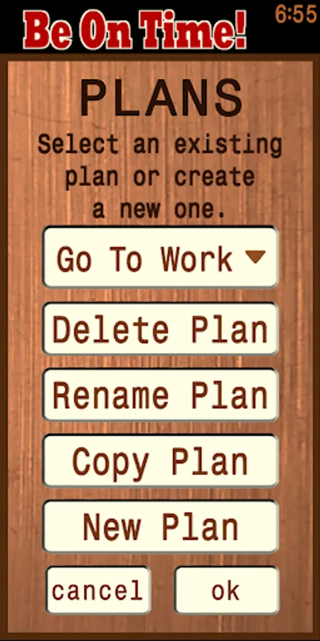 Be On Time! is an easy-to-use time management tool to help you get to where you’re going or complete your goal on time. You will create a Plan, enter your desired Finish Time for the Plan, fill the Plan with Activities, enter duration estimates for how long each Activity will take. From that information, the app will calculate what time you need to start each Activity so that you can complete your Plan on time.
