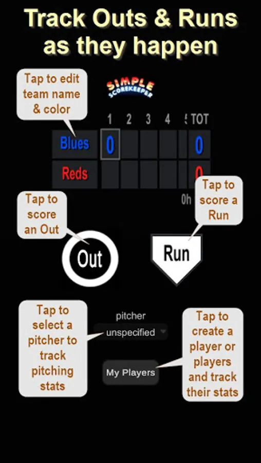 If stat tracking is more than you care to do, the app works perfectly well as a simple runs and outs counter. If you don't create a season, you can still keep score for a game, just runs and outs, no other stats. You can tap a team's name to edit their name and color.