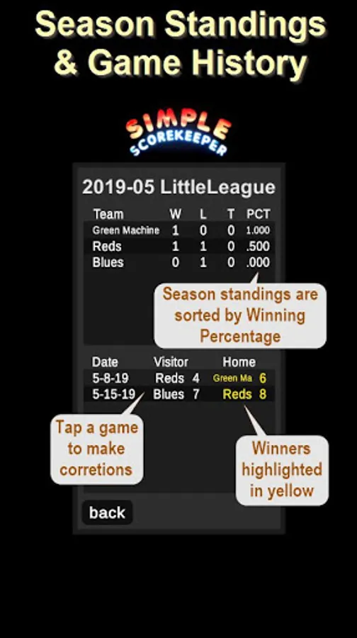 But this app does so much more than simply keep score. If you choose, it will automatically track your team's win-loss record. Just create a season, in that season create your team and any opposing teams as you play them, then select those teams when you start to keep score of each game. After the game, the Stats button will reveal the teams' win-loss records for this season or any other seasons you scored from months / years past. If you use the exact same team name season over season, year over year, the app will track that team's win-loss records across the seasons. (You can easily edit team names to make them match across seasons after the fact if necessary.)