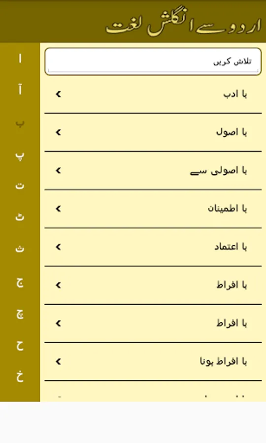 اردو سے انگلش لغت (ڈكشنری) 70000 سے زائد الفاظ کا مجموعہ، اردو الفاظ تلاش کریں، اردو کی بورڈ کی سہولت کے ساتھ، امریکن تلفظ کے ساتھ، بہت ہی آسان اور فائدے مند ڈکشنری انٹرنیٹ کے بنا بھی چلے "صرف پہلی بار انٹرنیٹ کی ضرورت ہو گی"