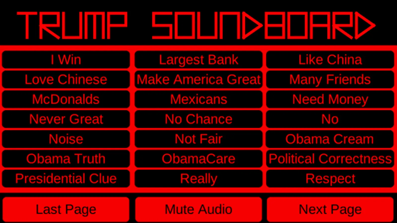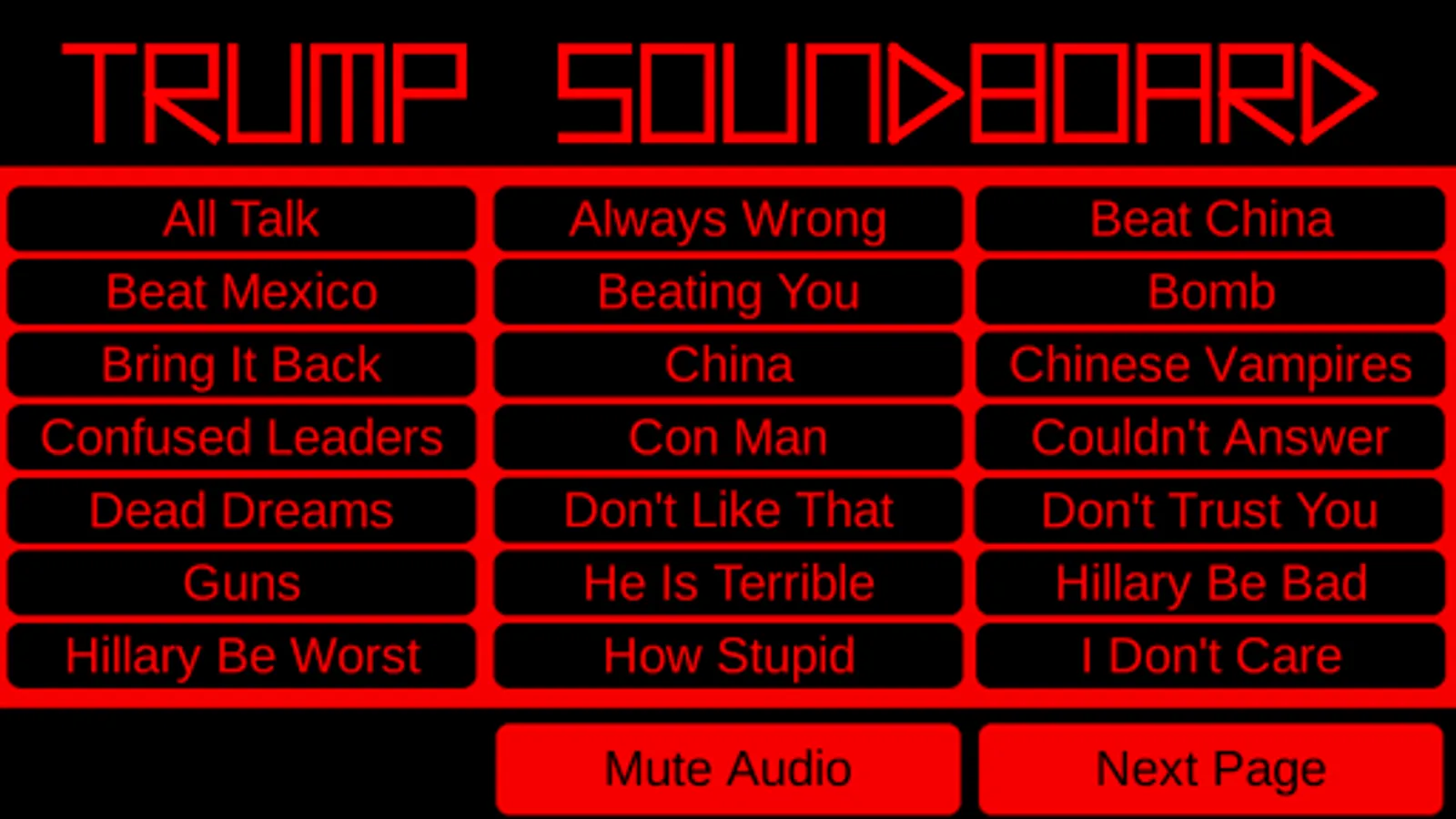 The soundboard for all of the amazing sounds Trump makes. This soundboard's was inspiration was the man Donald Trump himself. Donald Trump has had a lot of speeches in the past and this soundboard takes all of the sounds Trump makes and captures it in the perfect app format.