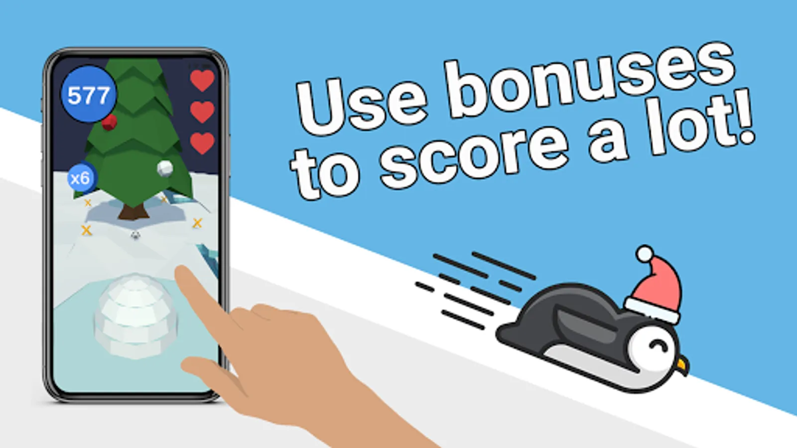 Don't hesitate to use penguins at igloo to hit presents because they are happy as long as they hug gift boxes. Also there are bonus modes like combo rain or reverse mode to increase your joy, score.