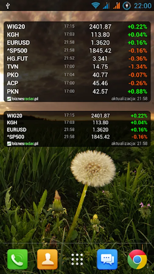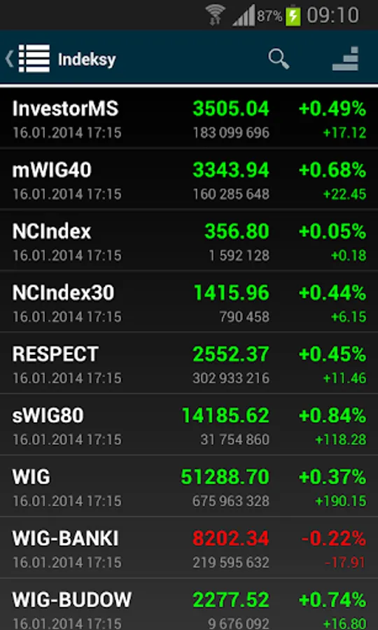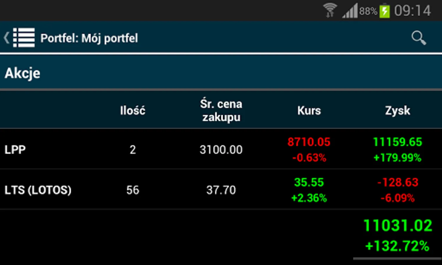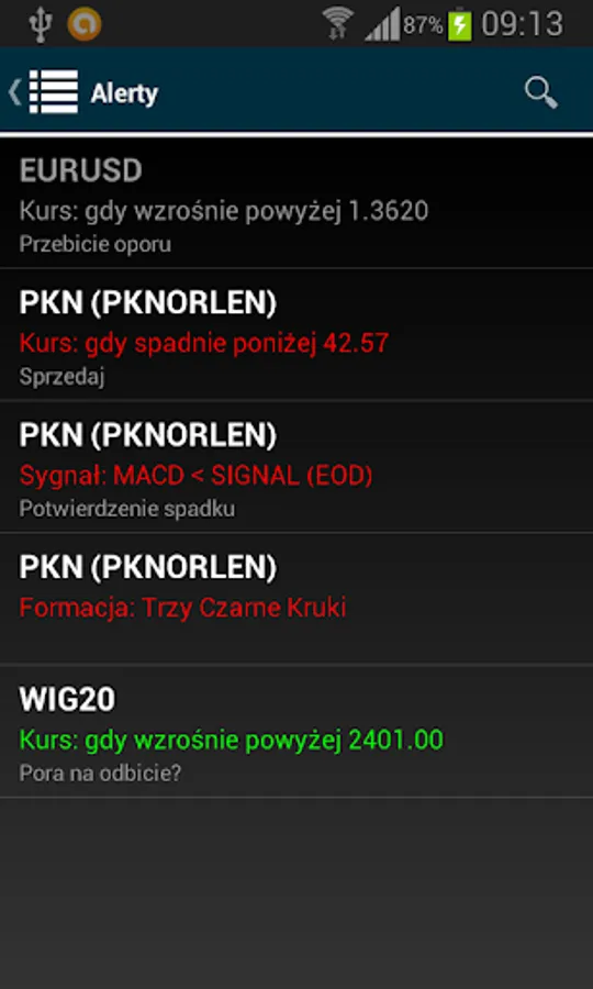 BiznesRadar.pl lets you track your stock quotes. Directly in the application, users can also track their own investment via an integrated service BiznesRadar.pl investment portfolio. There are also alerts so that you will be notified of the expected change of the exchange rate instruments, speech signals popular technical analysis and candlestick formation.