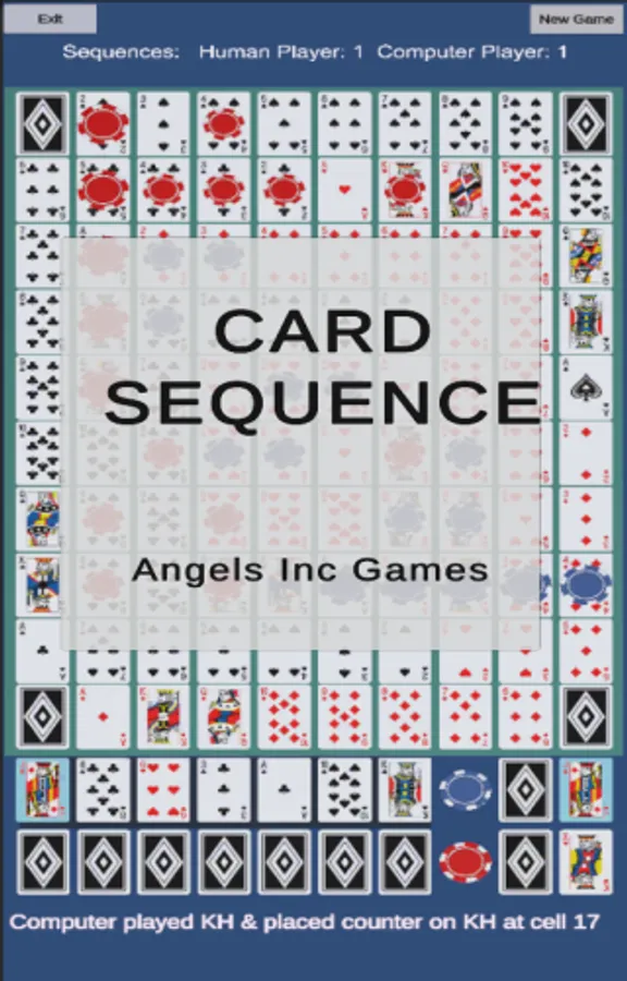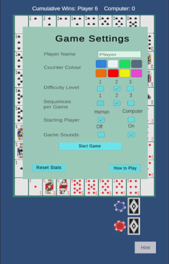 * IF YOU ARE NEW TO SEQUENCE, THE COMPUTER MAY BEAT YOU MOST OF THE TIME, IF SET TO THE HIGHEST DIFFICULTY LEVEL. This is just because it works out the best way of playing its cards to make sequences or block your sequences, and not because it cheats. To help beginners, I have weakened the way it plays on the lower difficulty settings.