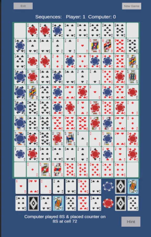 Each player is initially dealt seven cards from a double pack of 104 playing cards. The cards the player holds determine which board squares the player may play a counter on. At each turn the player plays a card from his hand, puts a counter on one of the matching squares on the board and receives a replacement card. Play alternates between human and computer players with each player trying to form his own sequences of five adjacent counters (or four plus a corner square), while also trying to block sequences that the other player is trying to form.