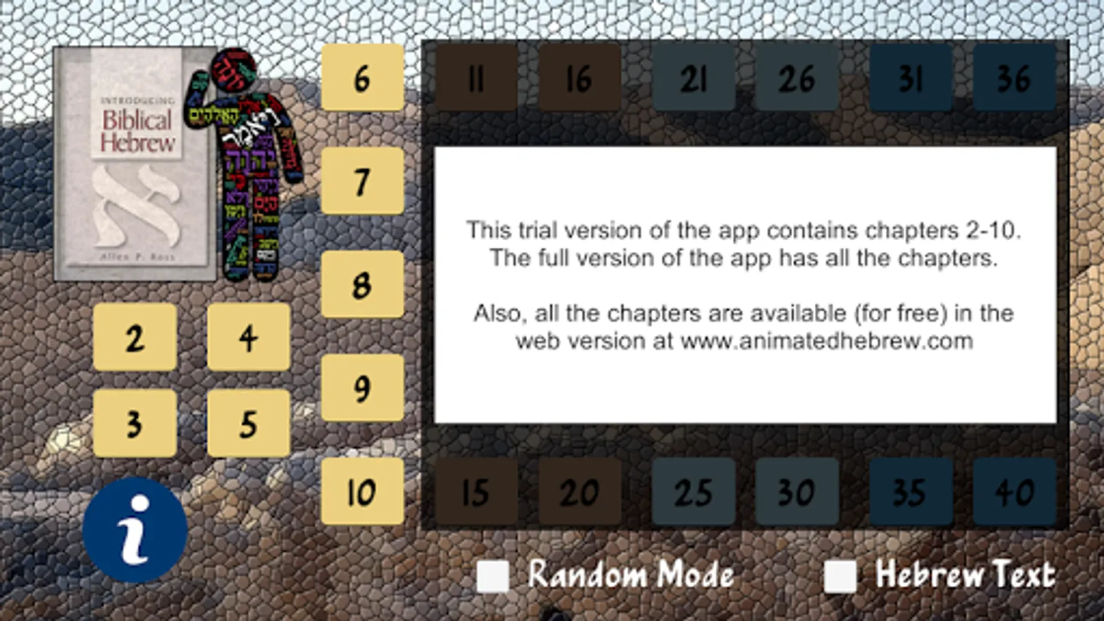 The trial version of this app covers chapters 2-10 of Ross. The full version covers all the chapters (2-40). The full version is also available – for free – as a web app on my website www.animatedhebrew.com.