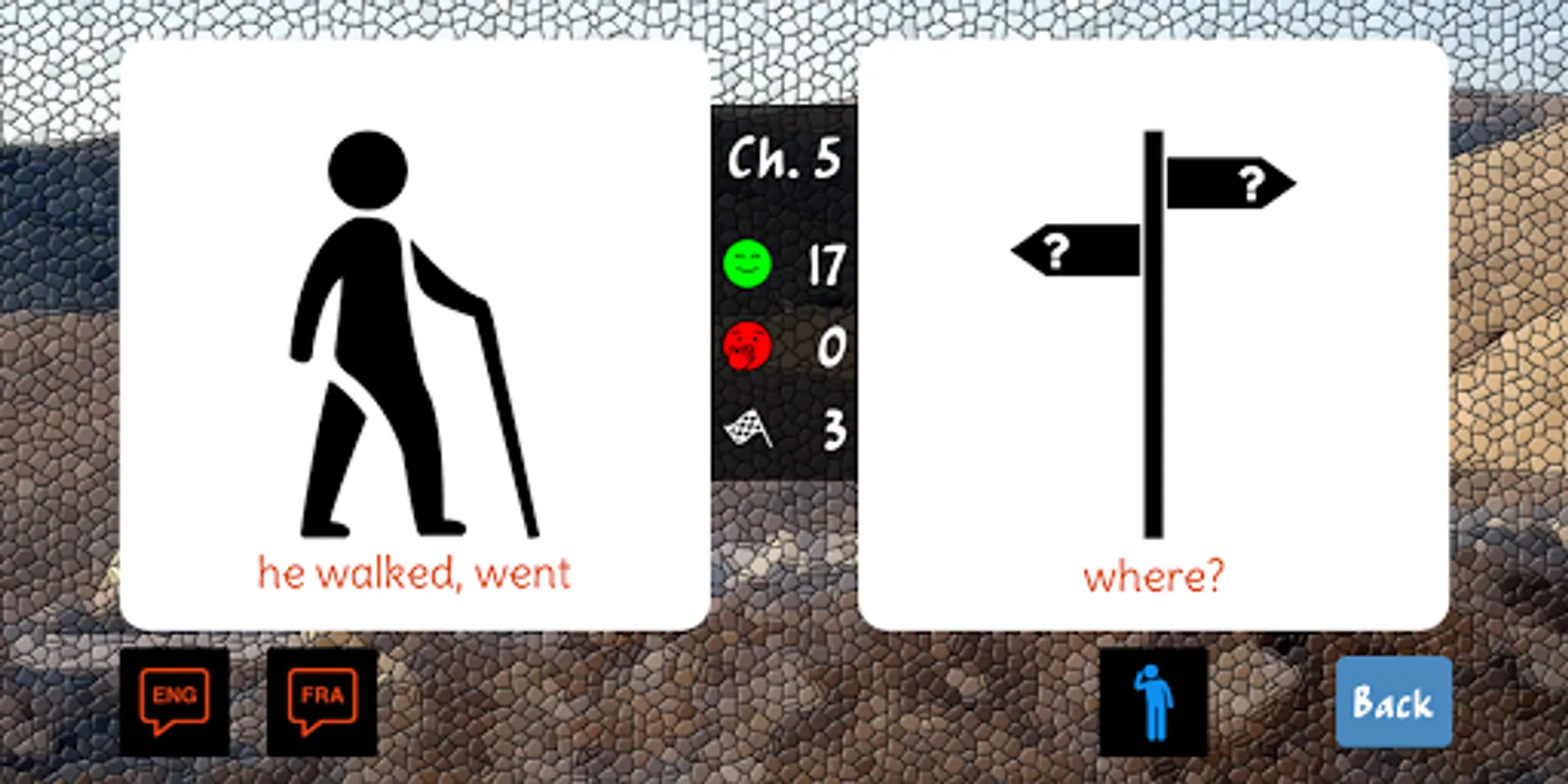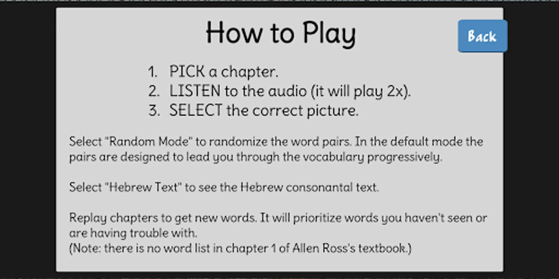 This is a Biblical Hebrew vocabulary app which focuses on learning by ear. You will be shown a pair of pictures and asked to pick the correct one based on what you hear. Words are pronounced by native Hebrew speaker Gal Stern – so you know you'll be hearing good Hebrew. The pairs of pictures are organized so they build upon each other making learning intuitive and natural, and requiring no previous Hebrew knowledge whatsoever. The word lists come from Allen Ross's first year textbook "Introducing Biblical Hebrew". There are 486 words.