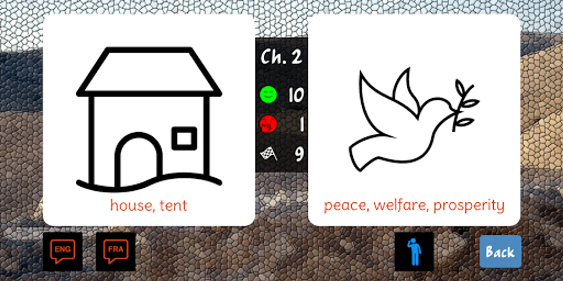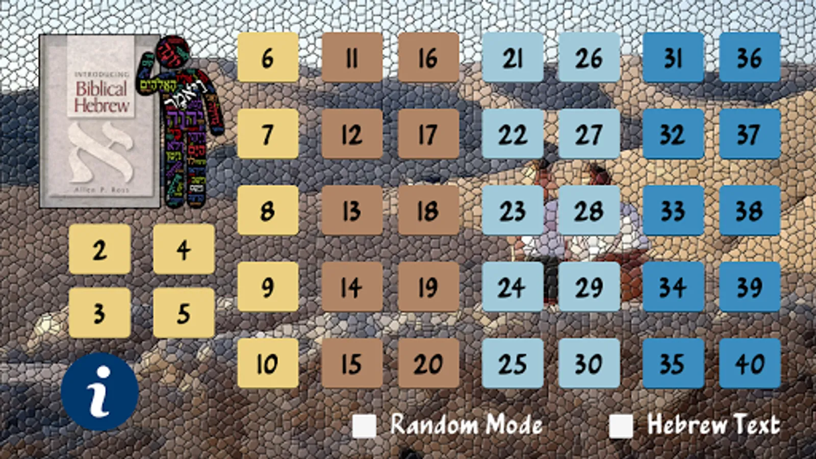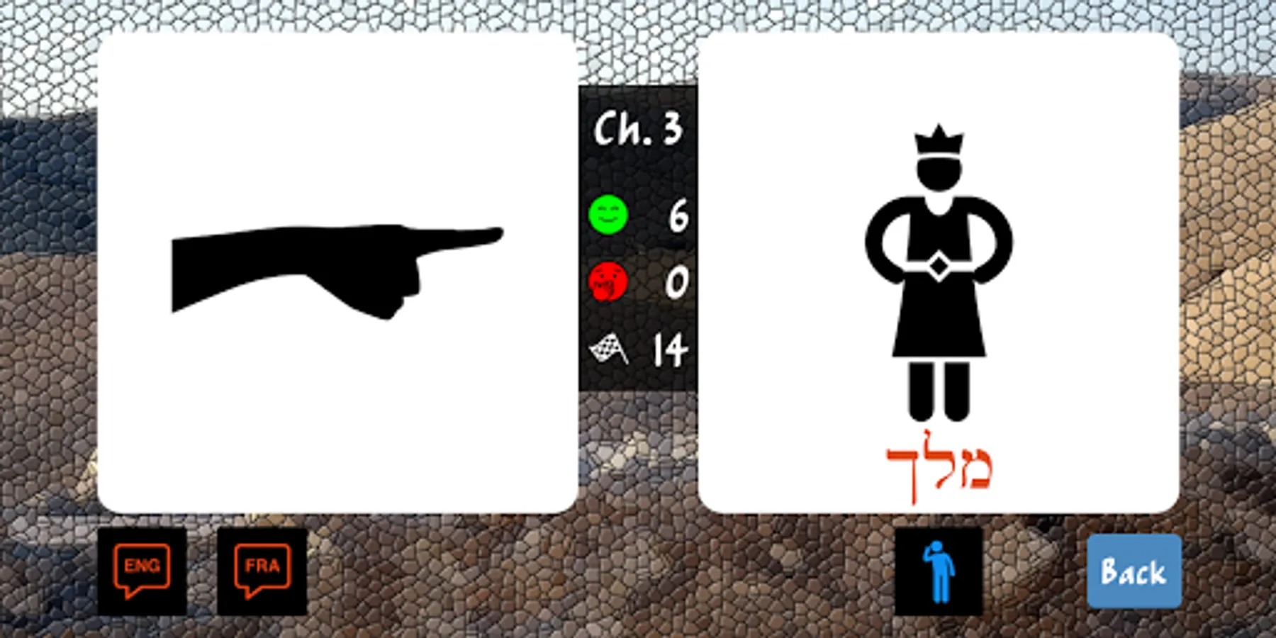 This is a Biblical Hebrew vocabulary app which focuses on learning by ear. You will be shown a pair of pictures and asked to pick the correct one based on what you hear. Words are pronounced by a native Hebrew speaker – so you’ll be hearing good Hebrew. The pairs of pictures are organized so they build upon one other making learning intuitive and natural and requiring no previous Hebrew knowledge whatsoever. The word lists come from Allen Ross's first year textbook "Introducing Biblical Hebrew". There are 486 words.
