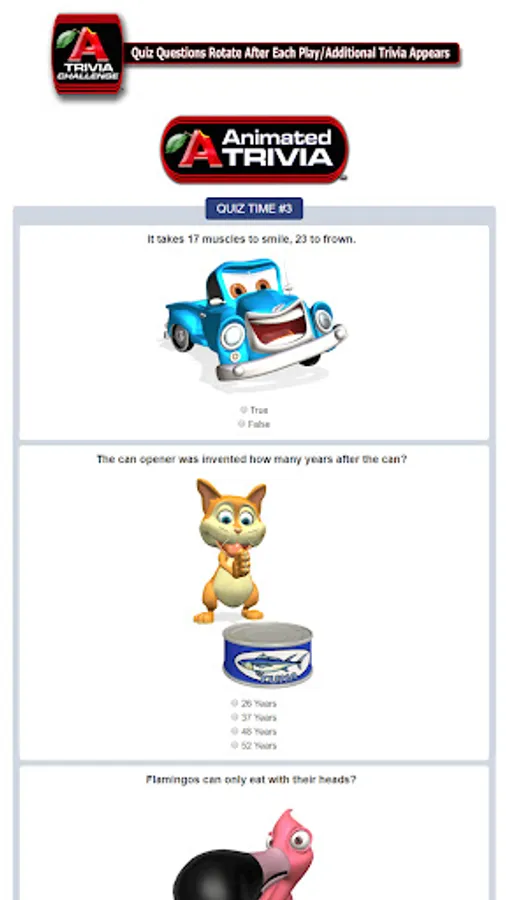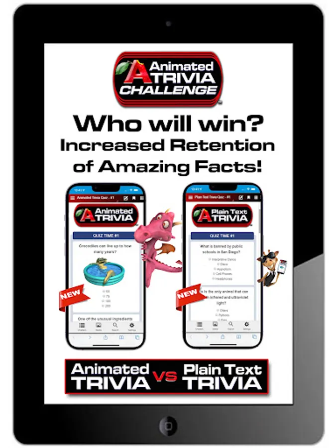 Animated Trivia increases retention of amazing facts more than Plain Text Trivia - take the challenge and see for yourself, who wins? Play the game again and again...questions rotate and new trivia added, but your trivia retention is tested. Who wins? Increased Retention of Amazing Facts!