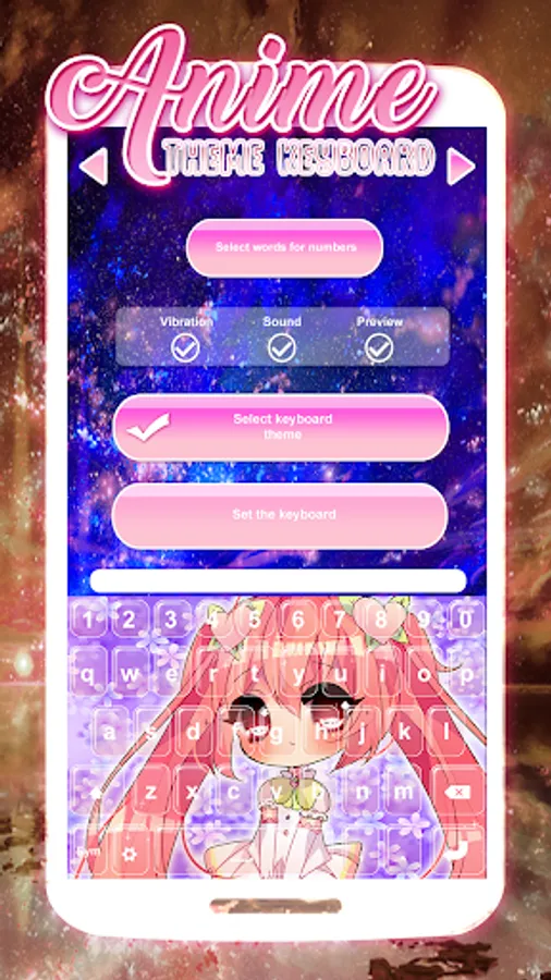 💖💛 Click on free install and provide the coolest anime style keyboards! It is high the time to change your plain touch screen keyboard to a colorful keyboard and become a modern user of our new creative product! If you feel sad and need something bright, pink and cute to cheer you up, then you’ve found just what you need. It’s amazing how a small free app can change your mood completely. Why are you looking for other keypads when you have a cute anime girl? Your search for the best keyboard theme for your mobile phone ends here. Thanks to our free smartphone app you’ll no longer have to consult different forums about how to change keyboard background. Make a good entrance, decorate funny text messages and be proud with 💖 Anime Theme Keyboard 💖!
