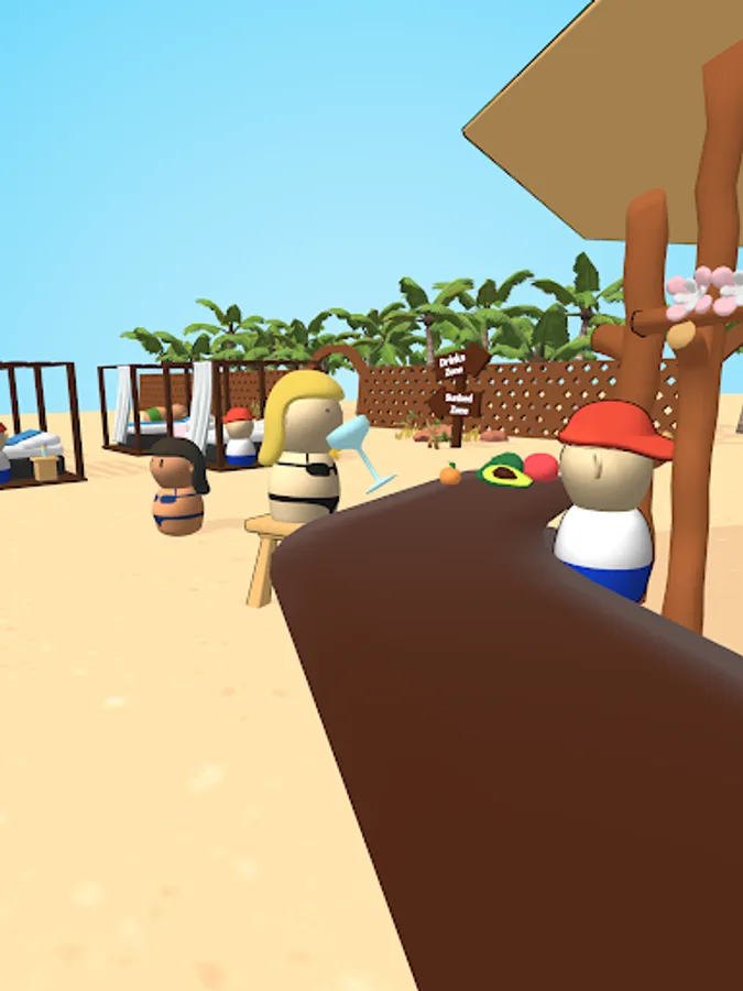 🏖️ Set up your cozy sunbeds and umbrellas to create the perfect relaxation spot for your customers. Take orders and serve refreshing drinks to keep them cool and happy. After a cold drink, enjoy the party!