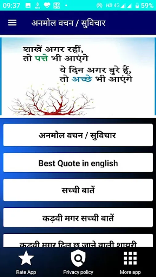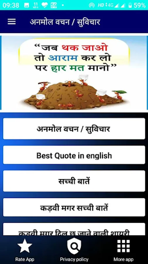 First install the app. Open it and you will get:- Every category on the front page. When you click on any of the categories, it will take you to the next page where it shows all related things. Just scroll and read. To share, just click on any share button.