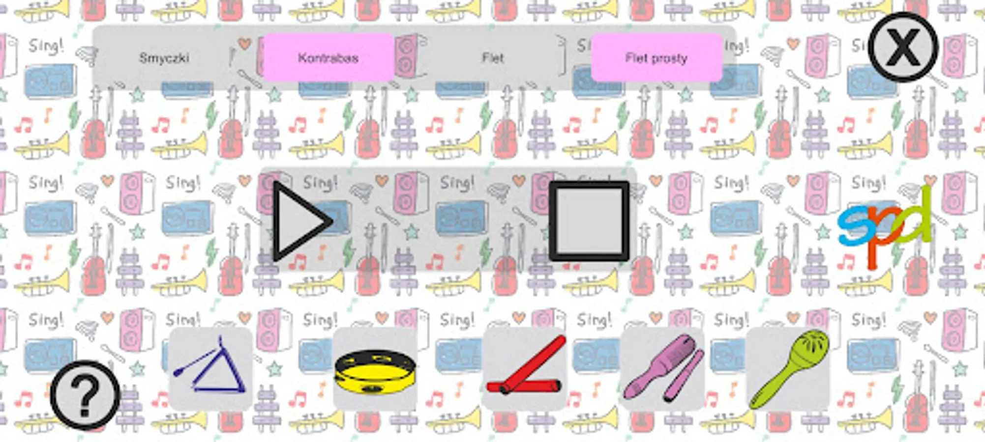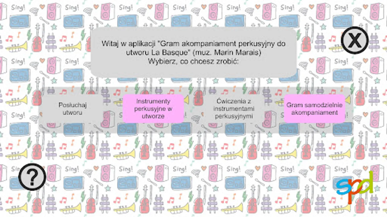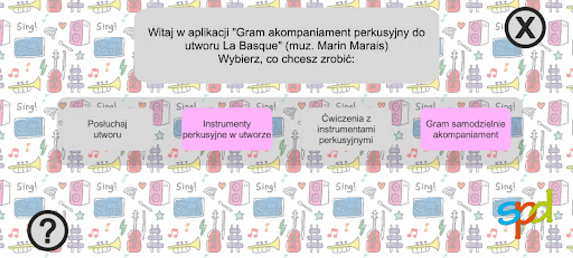 In the application I play the accompaniment La Basque (mus. Marin Marais) you will listen to the piece "La Basque", check the individual percussion instruments in the composition, practice with maracas, harps, etc. and play the entire accompaniment yourself.