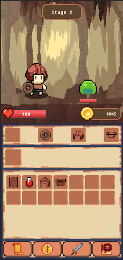 Explore the cave, collect various items, and merge them to create the best weapon.