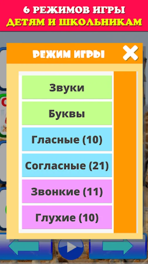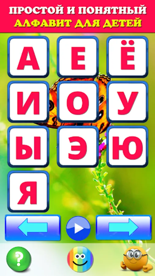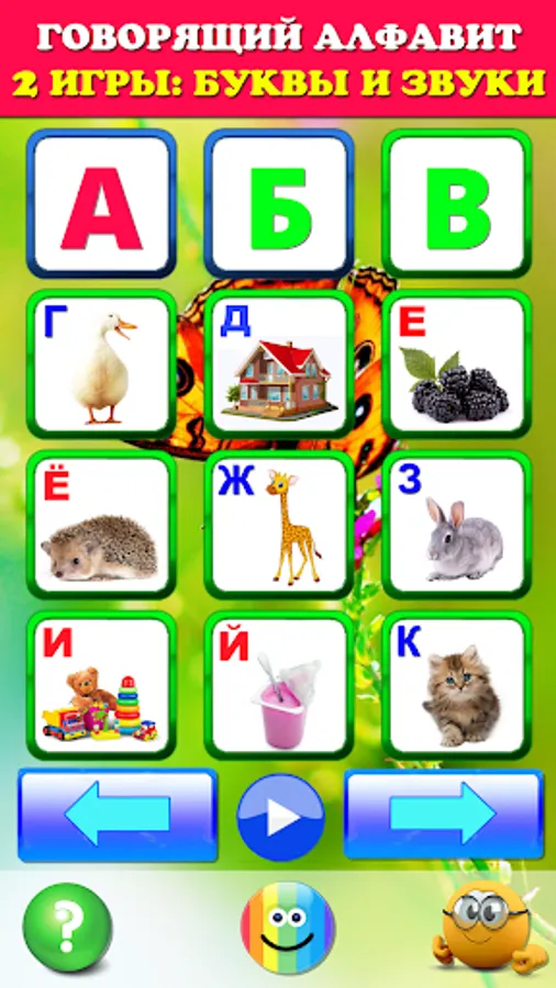 The speaking alphabet for children and toddlers is an educational game for children and their parents. Made with love, as I did for my daughter. There are many modes: letters, sounds, vowels and consonants, voiced and deaf. Colorful pictures, user-friendly interface, professional voice acting from a Russian language teacher!