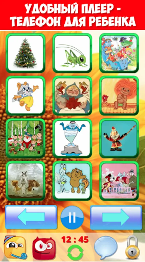 Songs for children and toddlers - for free and without internet! Large selection of children's songs from Soviet cartoons. They are filled with kindness and care of that time. Looks like a baby phone, the buttons are pictures from songs