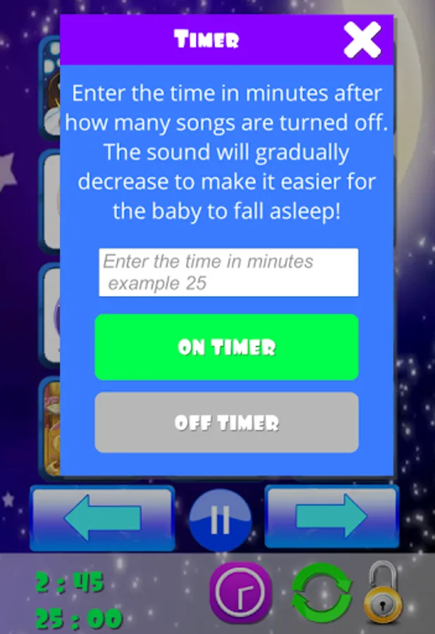 You can lock the app by holding the “lock” button on the screen. Hold it for 1,5 seconds and the screen will be locked so your child will not press anything occasionally. It will prevent their sleep from being disturbed by anything and the baby will not be scared by unexpected sounds.