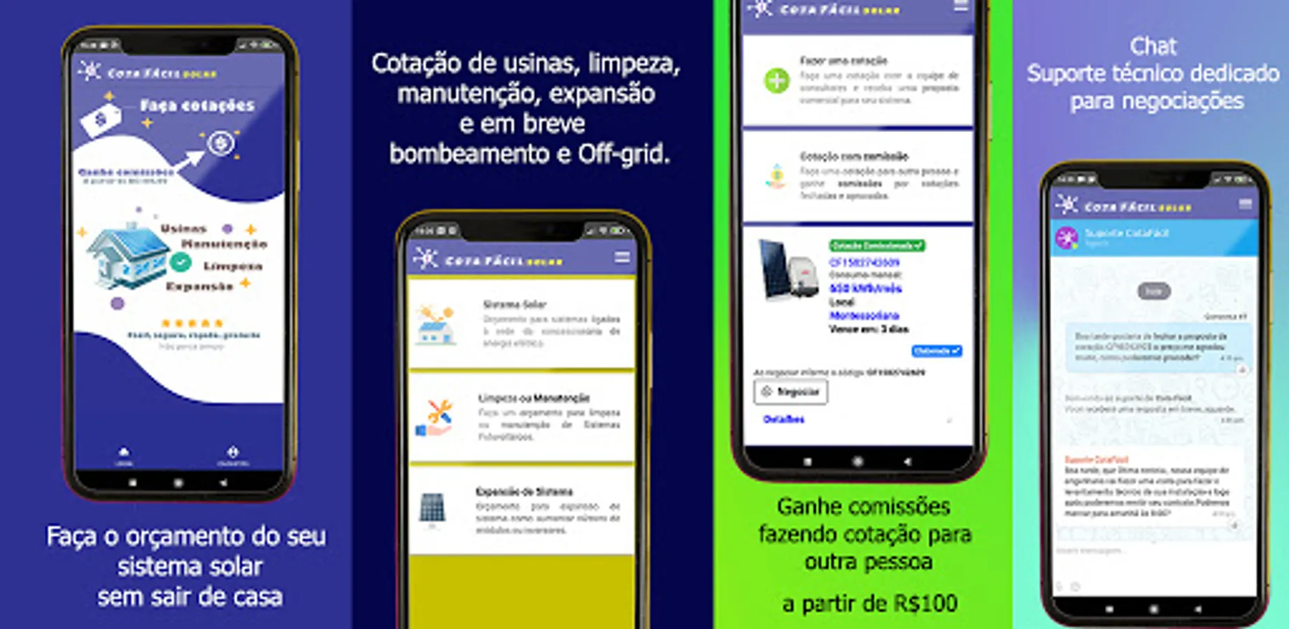 With Cota Fácil solar it is possible to quote photovoltaic systems, maintenance and cleaning! All dimensioned and managed by an engineering office that will seek the best equipment to meet your demand at an affordable cost! In addition it is possible to earn commissions by making quotes for friends or family, that's right you can earn money if you make a commissioned quote and that is accomplished!