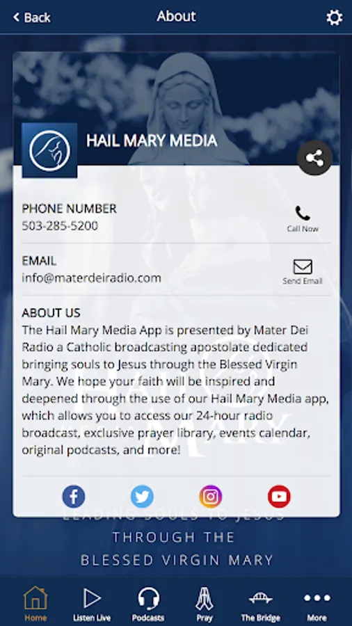 The Hail Mary Media app is the bridge between your faith and everyday life! Be uplifted by inspirational and informative media that conveys the joy of the Catholic faith. By downloading our free app, users can: ● Access our exclusive video and audio prayer library ● Sign up for customized prayer reminders ● Tune in to the live broadcast of Mater Dei Radio ● Listen to the podcast versions of our show recordings ● Explore our Catholic lifestyle section ● Discover local events, news, and more! The Hail Mary Media app is produced by Mater Dei Radio, a Catholic apostolate dedicated to bring souls to Jesus Christ through the Blessed Virgin Mary. Some of the shows produced at our studios in Portland, Oregon, include: ● The Morning Blend, with David and Brenda ● The Voice of the Shepherd, with Archbishop Alexander Sample ● Living Stones, with Ken Hallenius and Deacon Harold Burke-Sivers ● Blazing the Trail, with Miriam Marston ● View from the Pew, with Scott and Brenda Aikin ● Sunday Commentary, with Kevin and Carla ● Your Next Mission From God, with Julie Onderko