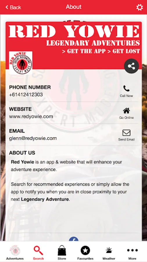 Red Yowie is an app & website that will enhance your adventure experience. Search for recommended experiences or simply allow the app to notify you when you are in close proximity to your next Legendary Adventure. > GET THE APP > GET LOST