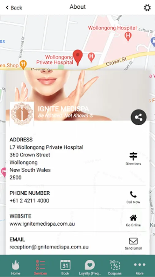 App for Ignite Medispa in Australia, offering: - Anti-ageing and cosmetic medical beautification, such as anti-wrinkle injections, fillers, lasers, mesotherapy, and threads; - Cosmetic surgery, such as for improving the aesthetics of the breast, body contouring, and more; - Cosmetic and general adult dentistry, with everything from routine hygiene and ZOOM! whitening to veneers; - Beauty and relaxation spa treatments, including medical-grade facials and relaxation massages; - Wellness treatments, for example, IV vitamins and NAD+. Ignite Medispa is the world's first medispa with dental facilities inside a hospital (Wollongong Private Hospital just South of Sydney). Be notice, not known ®