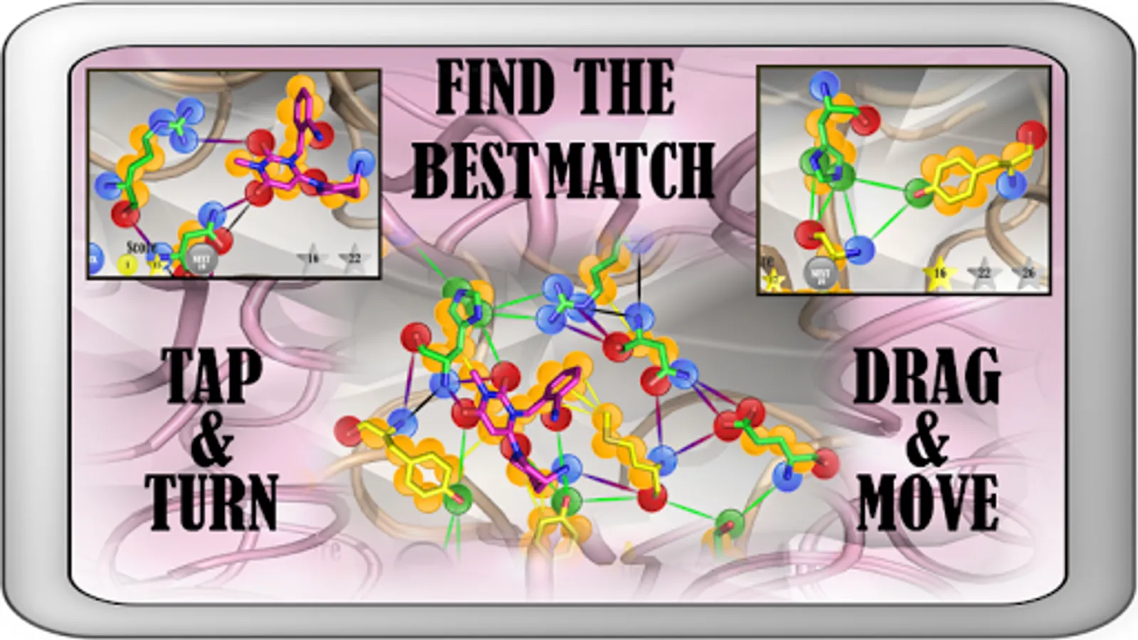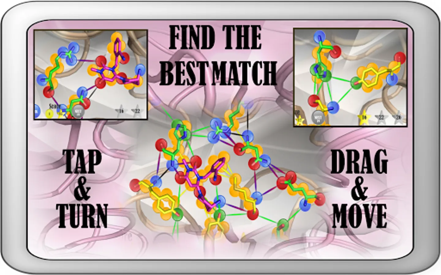 Are you ready to take on this new challenge?! Try to match a big molecule (protein) with a small one (ligand / drug), like a jigsaw puzzle you need to orientate all the pieces of the two molecules to maximize the number of possible interactions. Like a key (drug) and a lock (protein), you need to create the just right key hole to use that special key and unlock the next level.